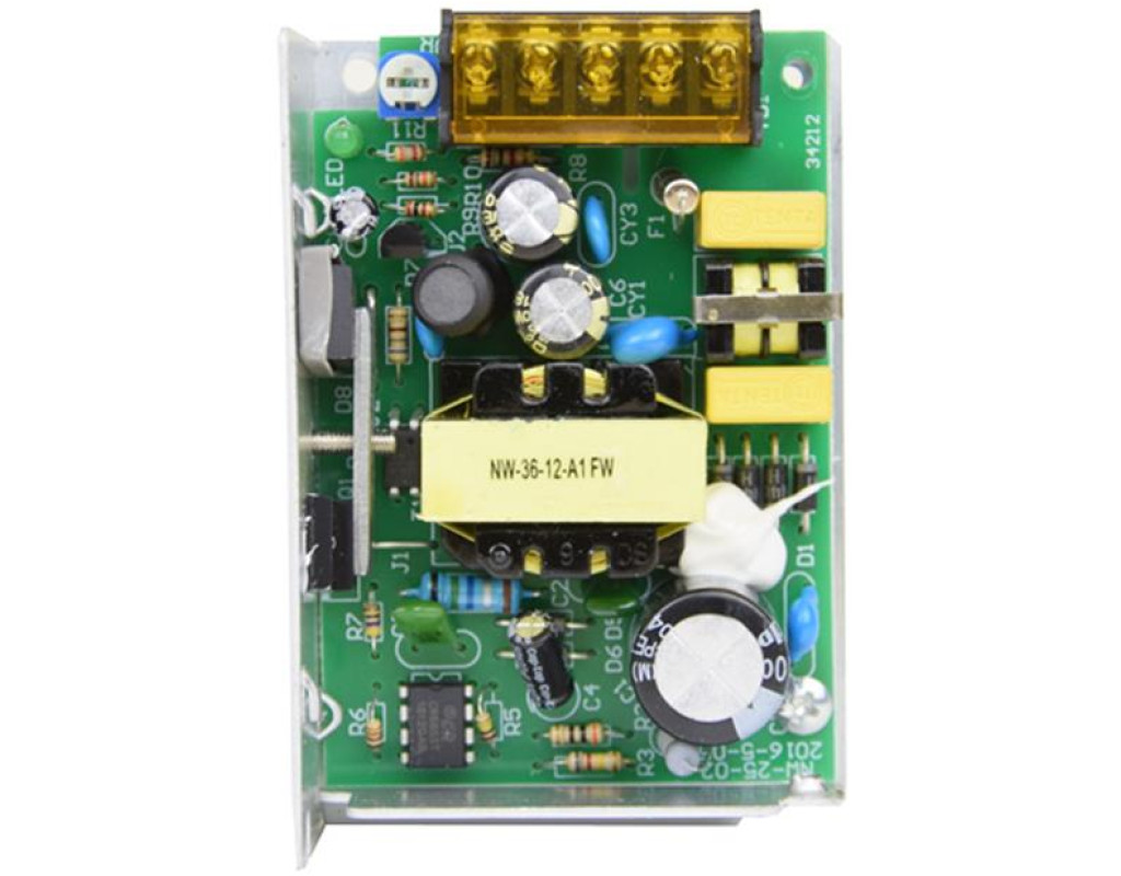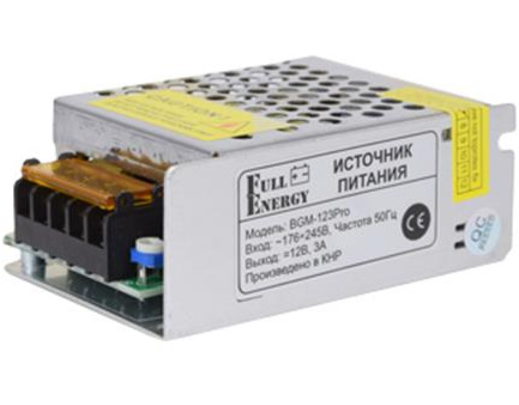 Вихід: +12/3А, клемник; Вхід: ~ 176-245В, клемник; Корпус металевий, перфорований; Розміри: 58x85x33мм. |