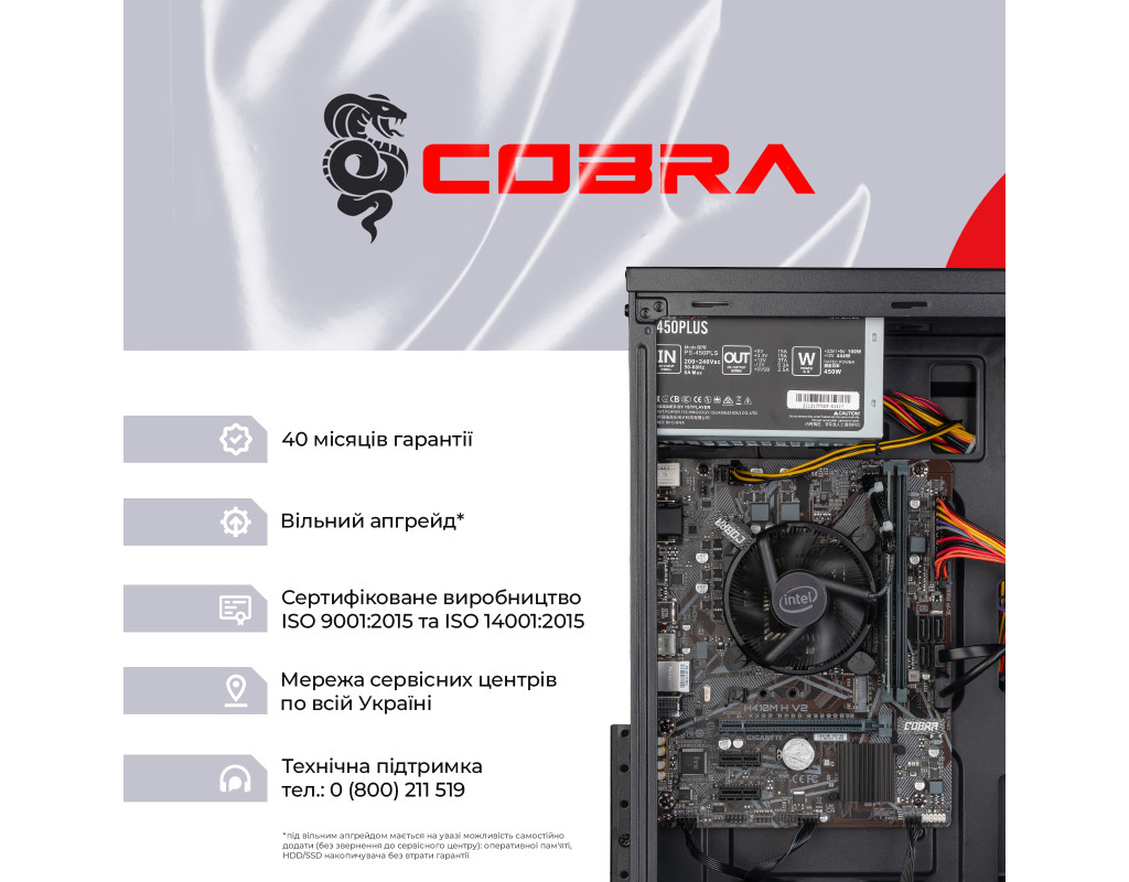 ПК COBRA збираються на базі комплектуючих визнаних світових лідерів, таких як Intel, AMD, MSI, ASUS, Zalman, ProLogix, Seagate, Toshiba, Hitachi, Transcend, Kingston і ін.