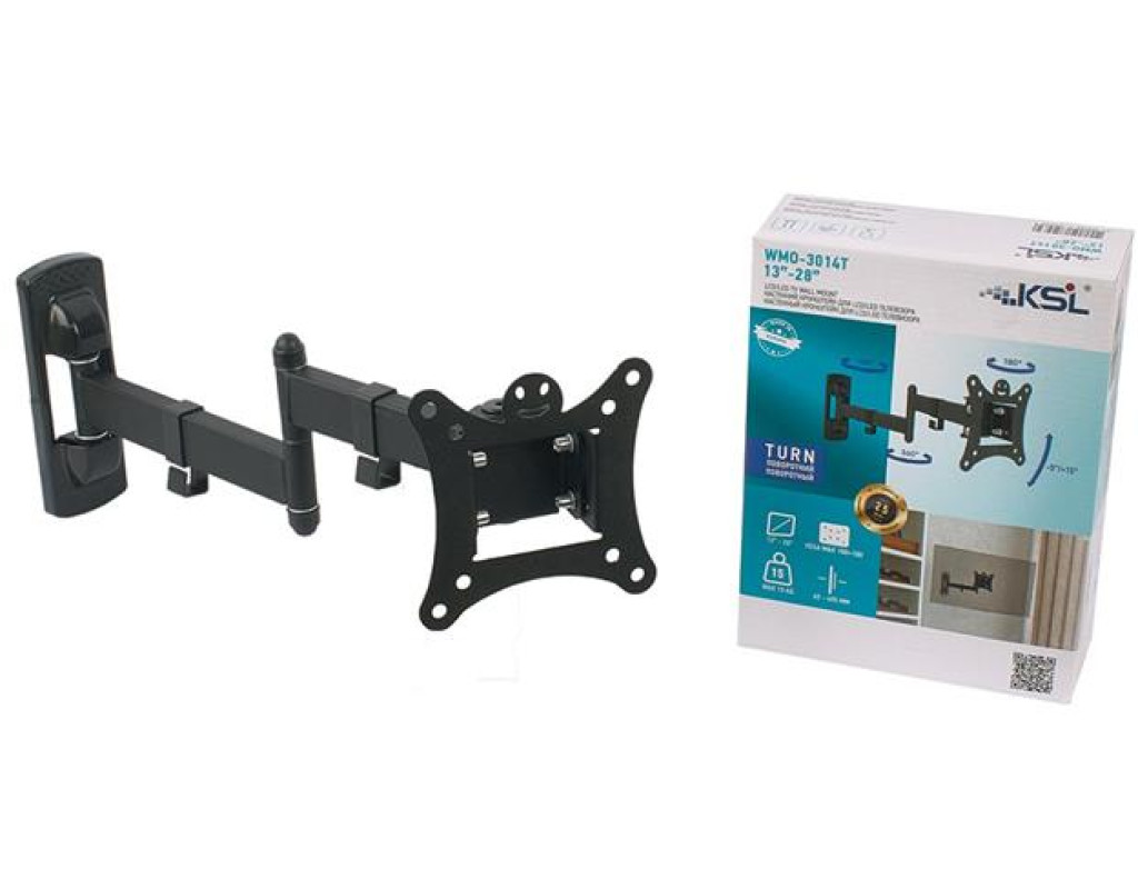 | Поворотний кронштейн з кутом нахилу KSL WMO-3014T (3 вузла повороту 180 °/360 °/180 °) - підходить для плазмових, LCD, LED телевізорів і моніторів з діагоналлю 13-28 дюйма і вагою до 15 кг. Підтримуваний стандарт VESA: від 75 х 75 мм до 100 х 100 мм.