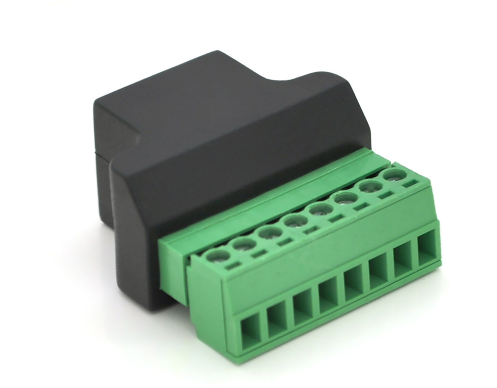 | Клемна колодка 8-розрядна Клемна колодка 8-розрядна + RJ45 8P8С мама - перехідник для передачі сигналу за допомогою крученої пари між пристроями, у одного з яких немає роз`єму RJ45. Характеристики: • інтерфейс - RJ45 • кількість контактів: 8; • ширина викрутки для затиску клем: до 2.5 мм; • розміри: 38 х 32 х 18 мм; • вага: 19 м |