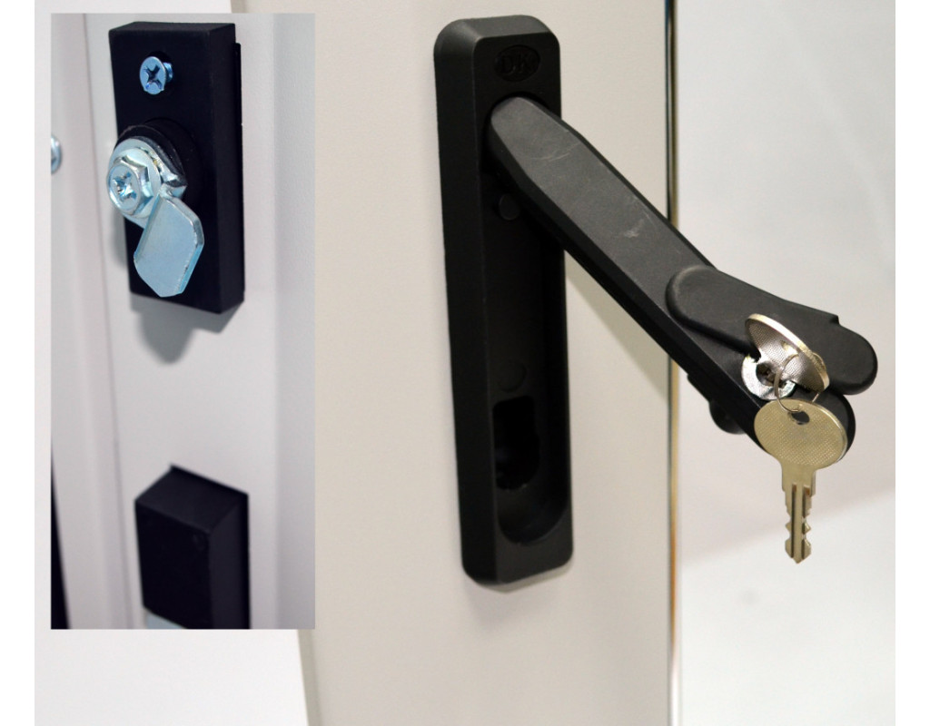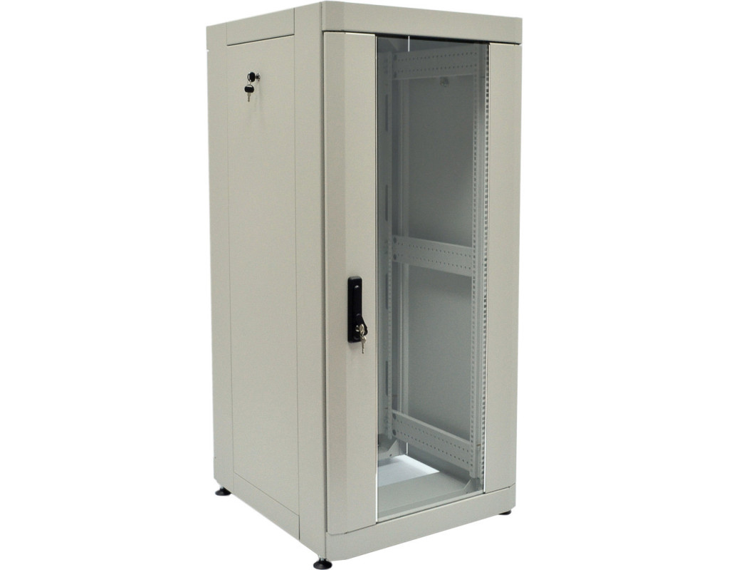 | Серверна шафа 19" 24U серії MGSE з передніми дверима з загартованого скла та задніми глухими дверцятами призначена для організації комутаційного вузла в офісних і серверних приміщеннях. Завдяки двом парам напрямних із лицьової й задньої сторони та допустимому навантаженню 450 кг, у шафах на чотири точки кріплення розміщують обладнання, як-від сервери, блок безперебійного живлення підвищеної ємності та полиці завглибшки понад 450 мм. Двостороння конструкція дає змогу як встановлювати обладнання з двох сторін, збільшуючи висоту в юнітах удвічі, так і масштабувати мережу в майбутньому, наприклад, у настінну шафу на 18U можна встановити тільки 18 патч-панелей, у підлогову шафу 18U встановлюється вже 36 панелей. Попри те, що 19-дюймові напрямні можна зафіксувати впритул до передніх або задніх дверей, треба залишати місце для з'єднувальних шнурів і кабельних організаторів. У зв'язку з тим, що комутаційна шафа має велику вагу і не завжди зібрану конструкцію можна пронести у вузьких коридорах або занести крізь вузький дверний отвір, вона постачається в розібраному вигляді в 3-4 коробках, кожну з яких може підняти одна людина. Шафа складається з максимально симетричних деталей, щоб спростити процес монтажу. Збираючи її, монтажник не думає про те, верх це чи низ, права деталь чи ліва. Виняток — це промарковані 19" напрямні та кріплення передніх і задніх дверей. Завдяки масовому застосуванню клепаних гайок і нарізаної різі, шафу може зібрати одна людина (немає з'єднань, де потрібна третя рука). Точність позиціонування елементів кріплення дає змогу дотягувати кожен гвинт відразу до кінця, що позбавляє потреби щось центрувати або регулювати. Охолодження серверної шафи можна реалізувати, встановивши вентиляційний блок із 3 вентиляторів SUNNON (замовляється окремо), який монтується замість заглушки. Кожну заглушку можна замінити вентиляторними блоками, які можна з'єднати між собою шнуром С13-С14 (комп'ютер — монітор). Кожен вентиляторний блок можна під'єднати до термостата й організувати каскадне вмикання. Живлення вентиляторного блока під'єднується за допомогою шнура CEE7-C13 (звичайний шнур живлення комп'ютера). У комплекті шафи MGSE на одну заглушку менше, тому в шафу заводять електричні та комутаційні кабелі через незаглушений отвір або замовляють щіткове кабельне введення, що монтується замість заглушки. Конструкція має 8 приварених гайок для монтажу ніжок, розташованих у кутах вертикального елемента каркаса, що дає змогу встановити комутаційну шафу в серверній і відрегулювати горизонтальне положення. 8 кріплень необхідно для того, щоб можна було поставити шафи впритул (в одній ніжки залишаються на краях, у другої — ближче до середини). 4 ніжки входять до комплекту. Для монтажу коліс необхідно самостійно зробити отвори в елементі каркаса.