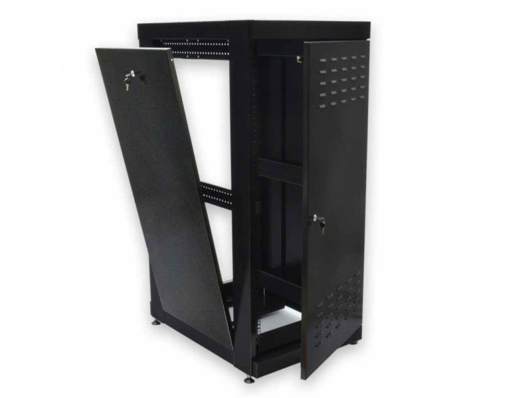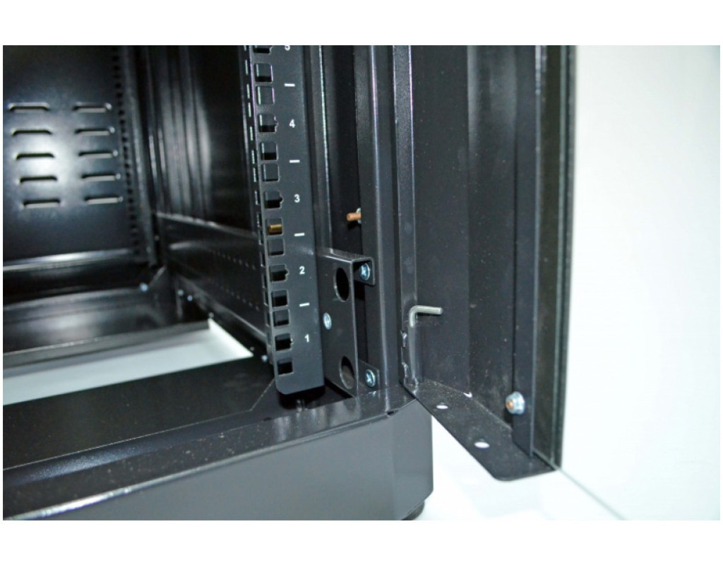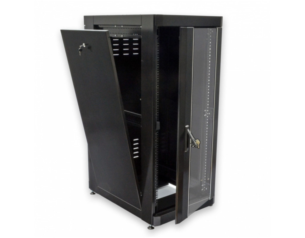 Серверна шафа 19» 28U серії MGSE з передніми дверима з розжареного скла і задніми глухими дверцятами призначена для організації комутаційного вузла в офісних і серверних приміщеннях. Завдяки двом парам напрямних з лицьового і заднього боку і допустимому навантаженню в 500 кг, у шафах на чотири точки кріплення розміщують обладнання, як-от сервери, блок безперебійного живлення підвищеної місткості і полиці глибиною понад 450 мм. Двостороння конструкція дає змогу як встановлювати обладнання з двох боків, збільшуючи висоту в юнітах удвічі, так і масштабувати мережу в майбутньому, наприклад, у настінну шафу на 18U можна встановити лише 18 патч-панелей, у підлогову шафу 18U встановлюється вже 36 панелей. Глибину шафи CMS обирають, виходячи з глибини серверного обладнання, яке потрібно в ній розмістити. Доступно три варіанти: 675 мм, 865 мм і 1055 мм. Глибина має бути не меншою за глибину сервера + 140 мм (на 70 мм виступає шнур живлення, 70 мм потрібно залишити перед переднім склом). Незважаючи на те, що 19-дюймові напрямні можна зафіксувати впритул до передніх або задніх дверей, треба залишати місце для з'єднувальних шнурів і кабельних організаторів. У зв'язку з тим, що комутаційна шафа має велику вагу і не завжди зібрану конструкцію можна пронести у вузьких коридорах або занести через вузький дверний отвір, її постачають у розібраному вигляді в 3-4-х коробках, кожну з яких здатна підняти одна людина. Шафа складається з максимально симетричних деталей, щоб спростити процес монтажу. Збираючи її, монтажник не думає про те, верх це чи низ, права деталь чи ліва. Виняток - це промарковані 19» напрямні та кріплення передніх і задніх дверей. Завдяки масовому застосуванню клепаних гайок і нарізаного різьблення, шафу здатна зібрати одна людина (немає з'єднань, де потрібна третя рука). Точність позиціонування елементів кріплення дає змогу дотягувати кожен гвинт одразу до кінця, що позбавляє необхідності щось центрувати або регулювати. Охолодження серверної шафи можна реалізувати, встановивши вентиляційний блок з 3-х вентиляторів SUNNON (замовляється окремо), який монтується замість заглушки. Кожну заглушку можна замінити вентиляторними блоками, які можна з'єднати між собою шнуром С13-С14 (комп'ютер - монітор). Кожен вентиляторний блок можна під'єднати до термостата й організувати каскадне вмикання. Живлення вентиляторного блоку під'єднується за допомогою шнура CEE7-C13 (звичайний шнур живлення комп'ютера). У комплекті шафи MGSE на одну заглушку менше, тому в шафу заводять електричні та комутаційні кабелі через не заглушений отвір або замовляють щітковий кабельний ввід, який монтують замість заглушки. Конструкція має 8 приварених гайок для монтажу ніжок, розміщених у кутах вертикального елемента каркаса, що дає змогу встановити комутаційну шафу в серверній і відрегулювати горизонтальне положення. 8 кріплень необхідно для того, щоб можна було поставити шафи впритул (в одному ніжки залишаються по краях, у другого - ближче до середини). 4 ніжки входять до комплекту. Для монтажу коліс необхідно самостійно зробити отвори в елементі каркаса.
