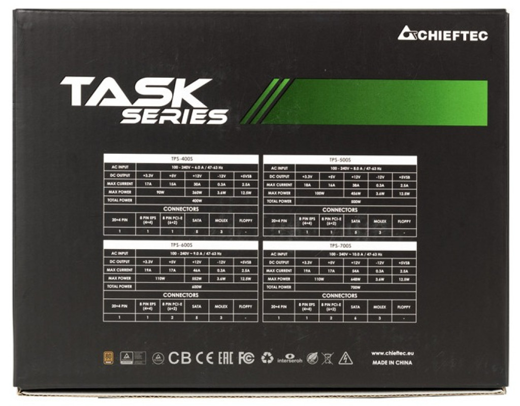 Блоки живлення серії Task від Chieftec цілком відповідають своїй назві — вони впораються з будь-яким поставленим завданням. Із сертифікатом із ККД 80PLUS Bronze і всіма сучасними характеристиками з безпеки, ви може бути впевнені, що цей блок живлення завжди ефективно впорається із завданням подавання живлення. З подовженими кабелями в 650 мм для материнської плати та процесора ці джерела живлення чудово підійдуть і для складання системи в більших корпусах.