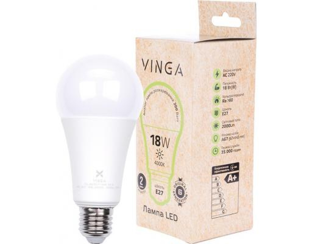 Лампочка Vinga VL-A67E27-184L-HLE світлодіодна Е27, споживана потужність - 18 Вт, колірна температура - 4000 К (нейтральний білий), 220 В, особливості - енергозберігаюча