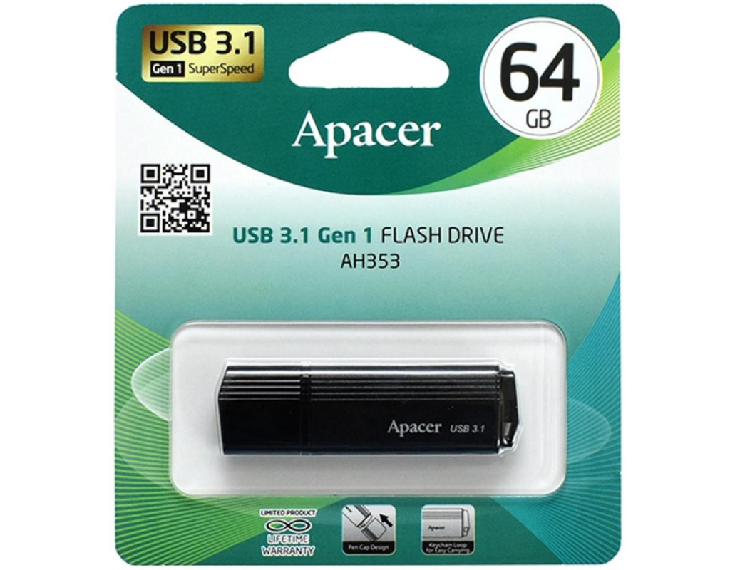 | USB флеш накопичувач 64 Gb Apacer AH353 Black USB 3.1 (AP64GAH353B-1) пластик/метал, вушко для кріплення до брелока |