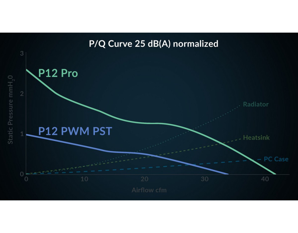 Більше потужності - менше шуму. Вентилятор забезпечує більшу продуктивність на низьких швидкостях з більшим повітряним потоком і статичним тиском лише на рівні 25 дБ(А) - ідеально підходить для тихого та потужного охолодження