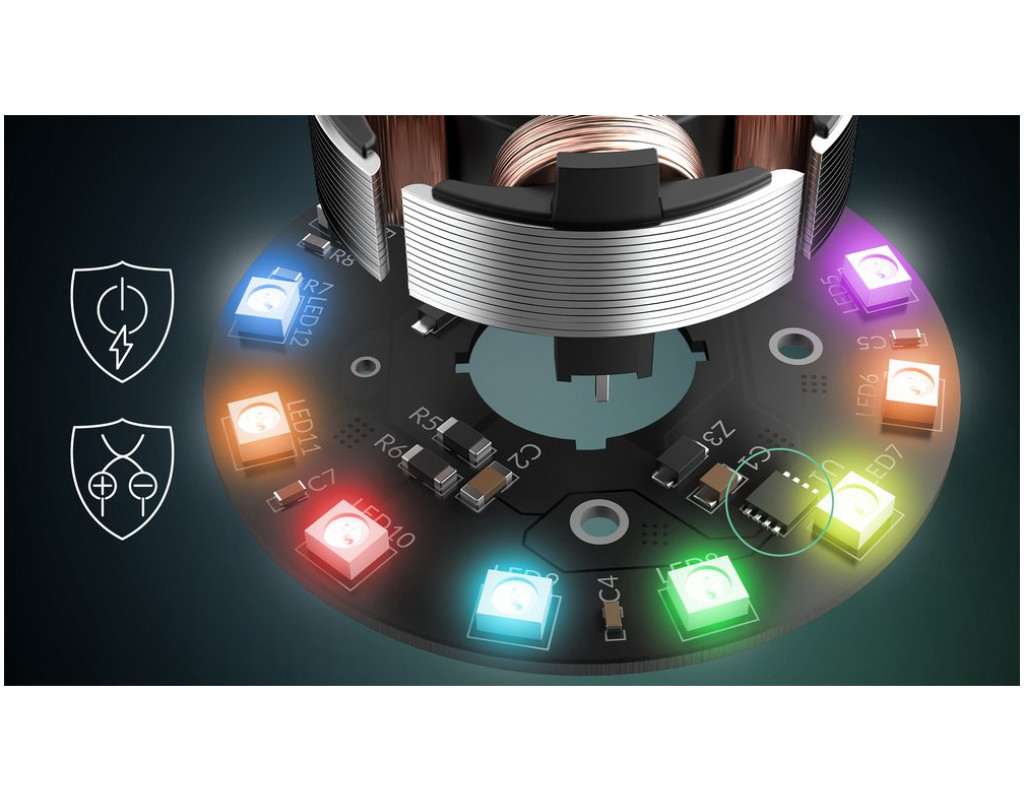 Ефективна робота при високому опорі повітря Завдяки високому статичному тиску вентилятори Pro ефективно проганяють повітря через вузькі простори. Це робить їх ідеальними для радіаторів, перфорованих панелей і сітчастих фільтрів. Максимальна продуктивність, переосмислена Оновлена конструкція лопатей вентилятора забезпечує оптимальний баланс між продуктивністю та плавністю роботи. Оптимізована конструкція підшипника та вала (FDB) Гідродинамічний підшипник у поєднанні з подовженим валом забезпечує тихішу роботу завдяки кращому розподілу тиску та мінімізації вібрацій. Автоматичне балансування у двох площинах Автоматизований процес вимірювання та балансування на двох рівнях забезпечує надзвичайну точність і плавну роботу завдяки точному нанесенню балансувальної маси на різній глибині. SOTA Мікроконтролер Знижує шум двигуна, компенсує коливання навантаження та захищає від пускових струмів і зворотної полярності. Більше потужності — менше шуму Вентилятор забезпечує високу продуктивність на низьких обертах, створюючи більший повітряний потік і статичний тиск при всього лише 25 дБ(A) — ідеально для тихого та потужного охолодження. Мінімальні зазори для максимальної ефективності Забезпечує високий статичний тиск і максимальну ефективність повітряного потоку. PST – синхронізоване керування вентиляторами на базі PWM Додатковий роз’єм PWM дозволяє синхронізувати кілька вентиляторів послідовно за допомогою одного роз’єму. |
