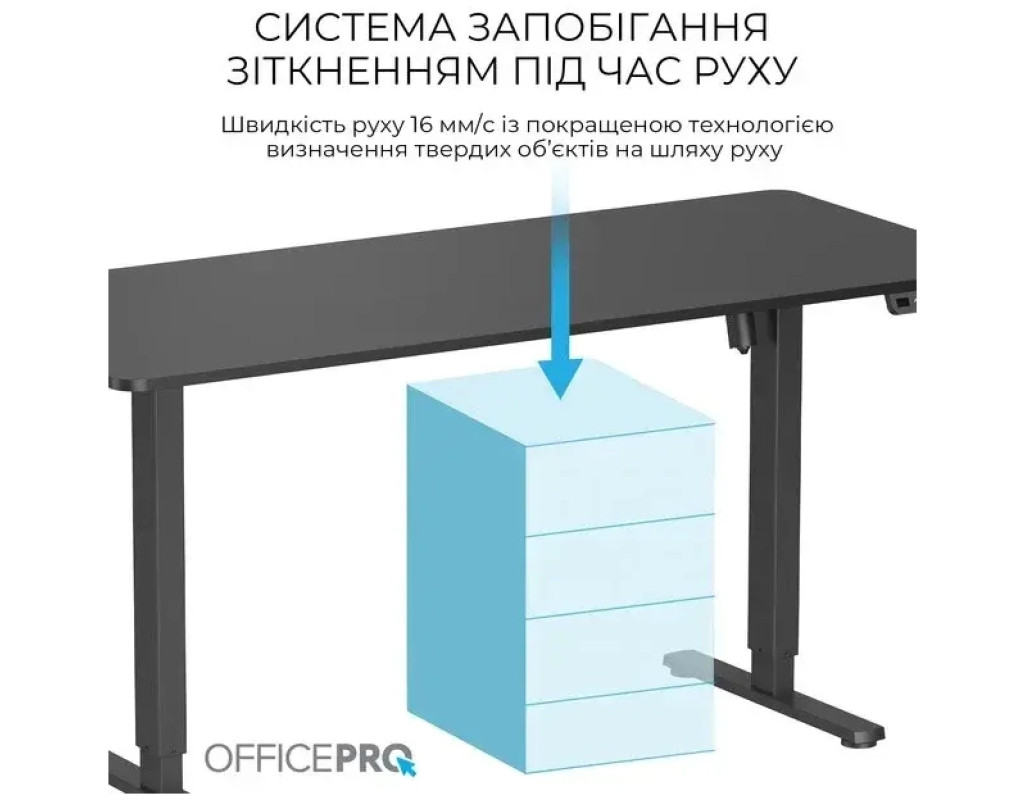 Потужні підйомні колони забезпечують тихий, плавний рух. Система запобігання зіткненням виявляє об’єкти на шляху руху, щоб запобігти зіткненням. Проста у користуванні панель керування дозволяє легко регулювати висоту, а програмовані налаштування пам’яті зберігають улюблені налаштування для додаткової зручності.
