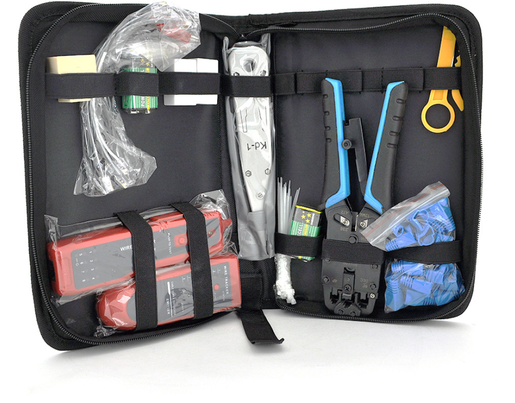 | Набір монтажника 11 в 1 Merlion (A135), HT-806, HT-200R, KD-1, Stripper, конектори, ковпачки, з'єднувач, розгалужувач, стяжки, крона, сумка |