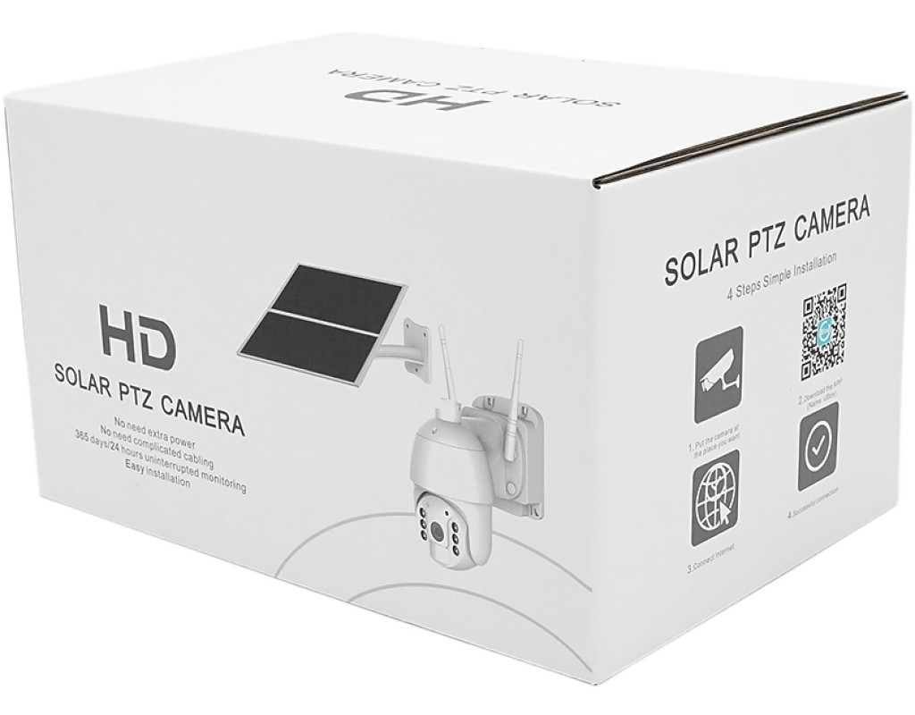| Поворотна відеокамера 4 Мегапікселі з вбудованим динаміком та мікрофоном З сонячною панеллю на 20ват З вбудованими АКБ 30000мА Камера здатна працювати 24 / 7 завдяки потужності сончної панелі та вбудованої батареї Камера з AI функцією визначення людини, автоматичне стеження за людиною push-повідомлення у додаток на телефон при тривозі руху Повне керування камерою з телефону, запис на SD карту (постійно / по тривозі руху) Подвійне підсвічування – ІЧ та Видимим світлом може працювати спільно або кожна окремо налаштовується у додатку 4G Стиснення відео H.265X Ширококутний об`єктив Super HD, висока якість зображення Інтелектуальний ІЧ-фільтр, автоматичне перемикання денного та нічного режимів ІЧ-підсвічування+Біле світло до 25 метрів Поворот на 360 градусів, віддалене керування Тип захисту корпусу IP67 Вбудований динамік та мікрофон, двосторонній аудіозв`язок Розрахований на багато користувачів віддалений доступ на смартфоні Автоматичне відстеження виявлення руху людини Повідомлення у програмі програми Запис картка Micro SD (макс. 128 ГБ) / хмарне сховище Підтримка програми UBox |