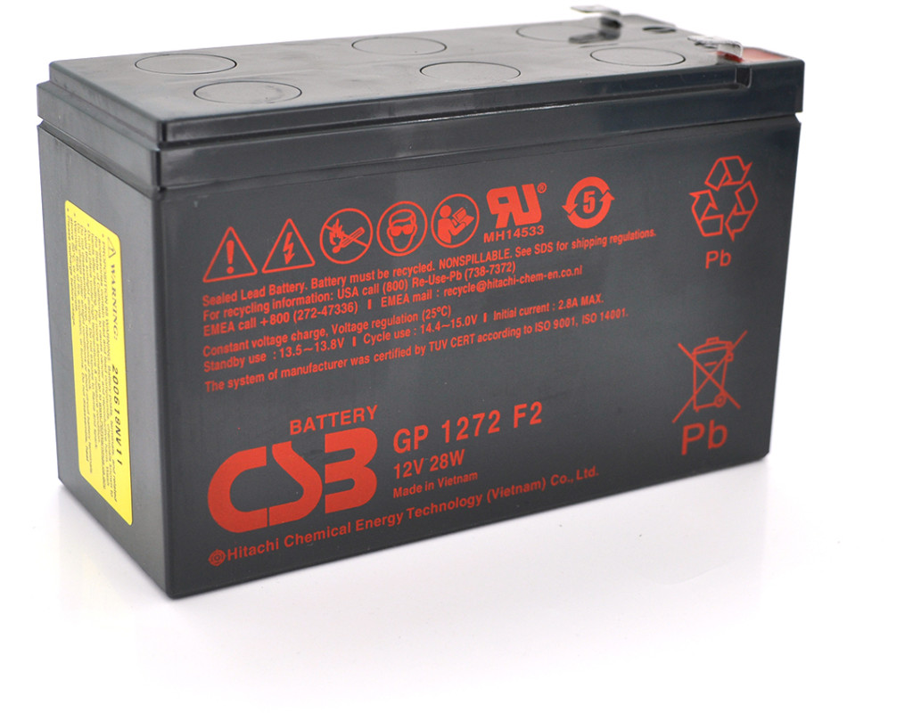 | Акумуляторна батарея CSB GP1272F2 – правильна батарея для твоїх пристроїв. Міцний корпус, довгий термін служби, широкий спектр застосування - це про акб CSB! Застосування: • джерела безперебійного живлення • у телекомунікаціях та промообладнанні; • у системах резервного освітлення • у складі систем відеоспостереження, сигналізації, контролю доступу • у мережах пожежно-охоронних автоматизованих комплексів Характеристики: • кількість елементів: 6 • тип клем - F2 • напруга – 12 V • ємність – 7,2 Ah при 20 годинному розряді до 1,75 В на елемент при 25°C • максимальний струм розряду – 130 А • максимальний зарядний струм – 2,8 A • внутрішній опір – 19 мОм • напруга заряду в циклічному режимі – 14,4 В ~ 15 В при 25 °С • напруга заряду в буферному режимі – 13,5 В ~ 13,8 В при 25 °С • номінальний діапазон робочих температур: 25°C • розміри пристрою (ДхШхВ) – 151х65х100 мм • вага – 2,2 кг (Допуск ± 5,0%) • термін придатності – до 5 років |