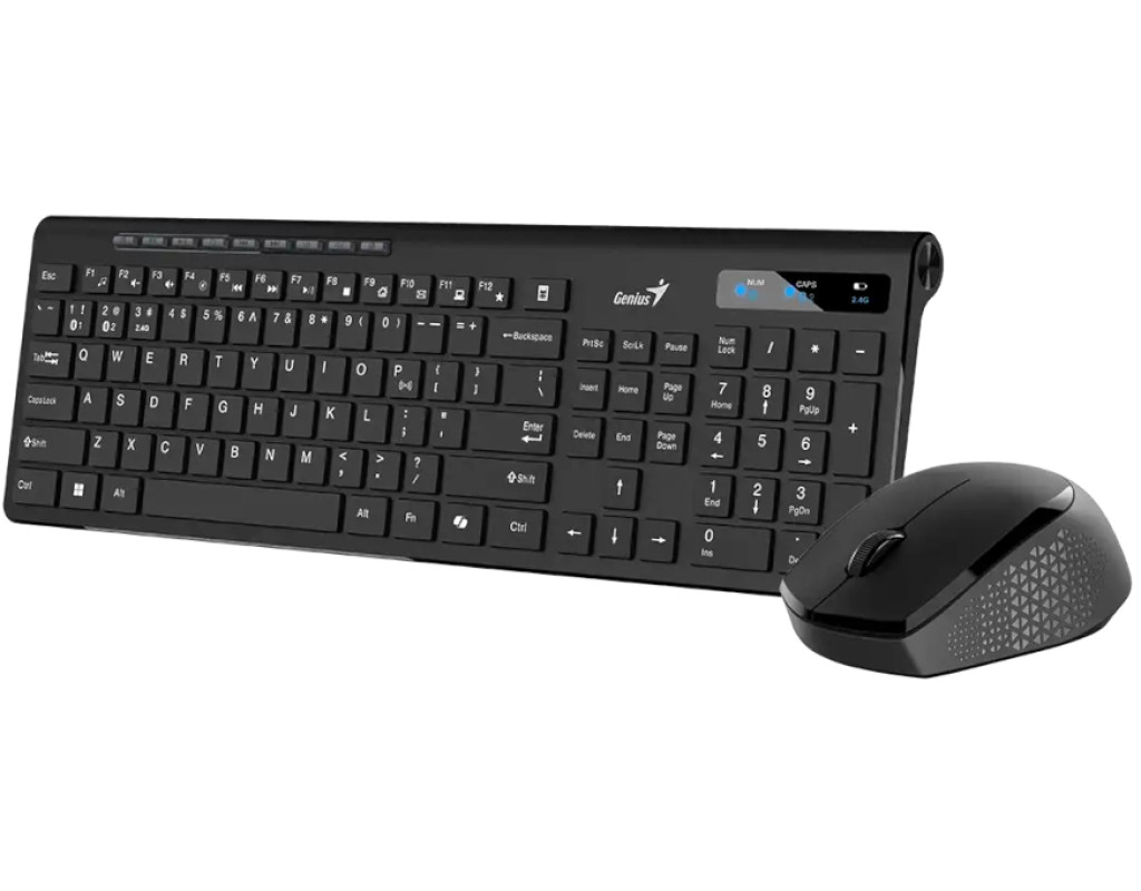 | GENIUS SlimStar 8230 (31340015424) Бездротовий комплект клавіатури та миші GENIUS SlimStar 8230 поєднує сучасний дизайн і зручність у використанні. Завдяки підтримці подвійного режиму підключення (Bluetooth 5.3 та 2.4 ГГц) ви можете легко перемикатися між комп’ютером, смартфоном, планшетом чи смарт-телевізором. Клавіатура оснащена 12 мультимедійними та 9 швидкими гарячими клавішами, що забезпечують миттєвий доступ до улюблених функцій — від відтворення музики до запуску пошти. Додатково передбачена клавіша AI Copilot для активації віртуального асистента у Windows 11.