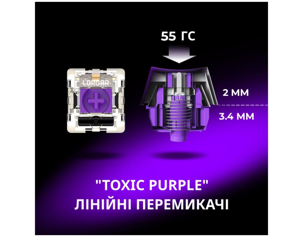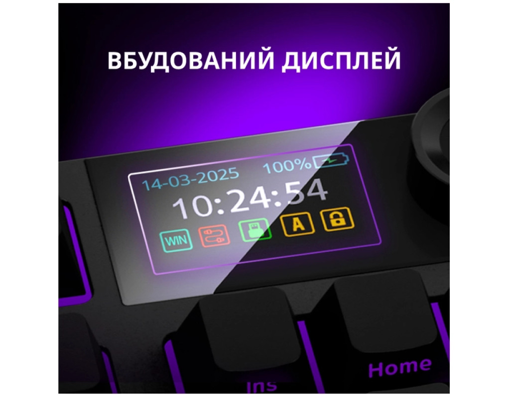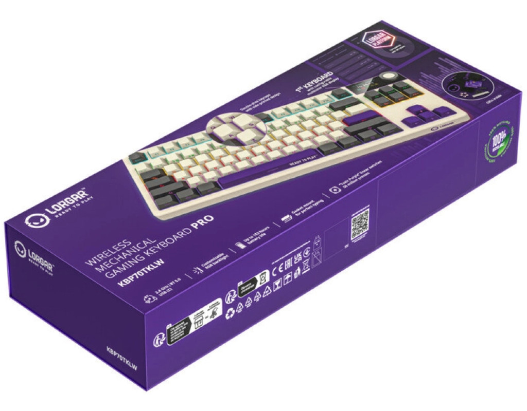 Lorgar KBP70TKLW — це високоякісна механічна клавіатура формату Tenkeyless, створена для геймерів і професіоналів, які цінують комфорт, надійність і стиль. Вона оснащена лінійними перемикачами LORGAR Toxic Purple з ресурсом у 50 мільйонів натискань, що забезпечують плавне та тихе введення. Завдяки гаскетному монтажу клавіші мають м’який хід і знижений рівень шуму. Клавіатура підтримує три режими підключення — Bluetooth 5.0, 2.4 ГГц і дротове USB-C, що дозволяє легко перемикатися між пристроями. Вбудований акумулятор ємністю 7200 мАг забезпечує до 153 годин автономної роботи. Ковпачки клавіш з PBT-пластику мають бокове гравіювання для довговічності. Адаптивний RGB-дисплей і смарт-регулятор додають функціональності та дозволяють налаштовувати підсвічування й мультимедіа. Гарячозмінні перемикачі дозволяють легко змінювати свічі без пайки. Це ідеальний вибір для тих, хто шукає баланс між компактністю, продуктивністю та естетикою. |