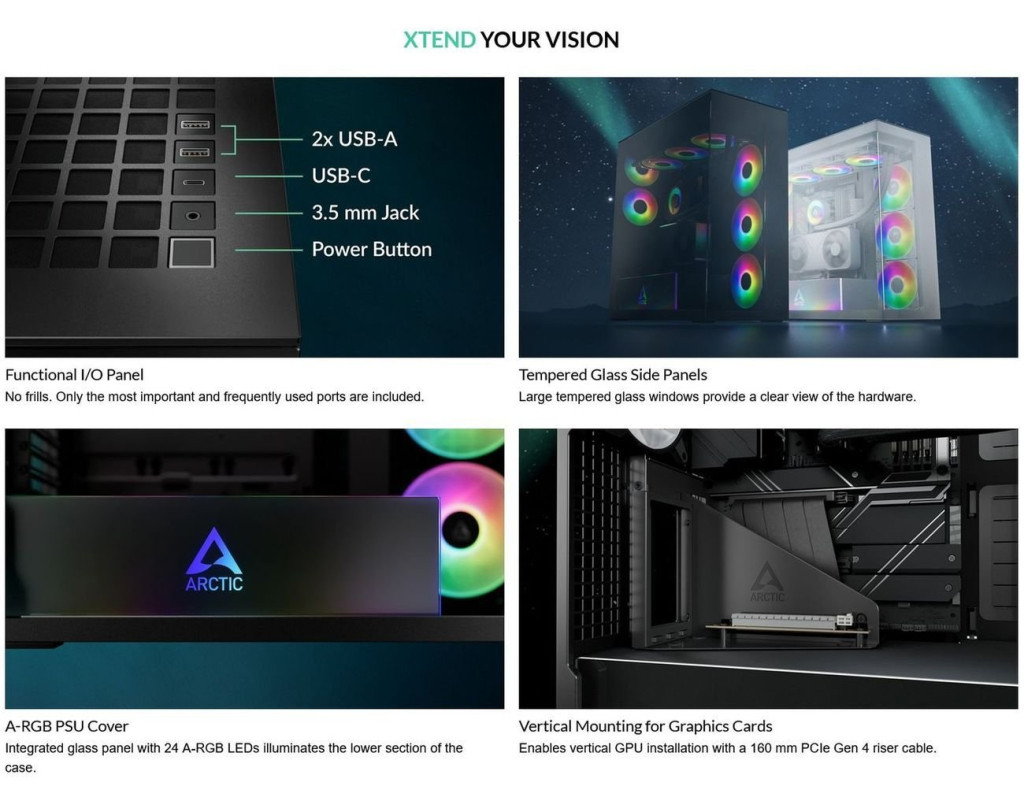 | Корпус для ПК Arctic XTENDERVG B (ACPCC00019A) — це справжня знахідка для тих, хто прагне зібрати потужний і функціональний комп'ютер, збережуючи при цьому стиль і естетику. Miditower формату, корпус абсолютно підходить для різноманітних застосувань: від мультимедійних станцій до складних ігрових систем. Він підтримує материнські плати формату Mini-ITX, E-ATX, ATX, Micro-ATX, що відкриває безліч можливостей для вибору компонентів та їх апгрейду. Одна з ключових особливостей моделі — вертикальне встановлення відеокарти, що надає змогу виділити графічний адаптер, роблячи його центром уваги в збірці. Це не лише естетично, а й функціонально: оптимізується повітряний потік, що забезпечує краще охолодження та стабільність роботи системи під навантаженням. Дзеркальна панель корпусу додає багатошаровість та сучасність будь-якій збірці. Вона відображає акценти RGB-підсвітки та створює враження бездоганно налагодженого внутрішнього простору. А класичний чорний колір надає корпусу універсальності, гармонійно поєднуючись з будь-якою кольоровою палітрою робочого місця. Інженери Arctic передбачили потужні можливості для охолодження. Корпус укомплектований двома 120 мм та трьома 140 мм вентиляторами, а також має додаткові місця для установки вентиляторів на верхній панелі. Вентиляційні отвори разом з місцем для систем рідинного охолодження забезпечують впевнений температурний контроль навіть у найпотужніших системах. Значну роль відіграє гнучкість конфігураційних можливостей. Arctic XTENDERVG B дозволяє розмістити два жорстких диски 3.5" та три твердотільних накопичувачі 2.5", що надає змогу зберігати великі обсяги даних та швидко їх обробляти. Кількість слотів розширення досягає семи, що дозволяє збільшити функціональність ПК шляхом додавання нових плат і технологій. Корпус оснащений всіма необхідними зовнішніми роз'ємами, включаючи порти для аудіо та USB 3.2, забезпечуючи швидкий доступ до важливих підключень. Система кабельного менеджменту через пилові фільтри підтримує чистоту та порядок, що сприятливо впливає на роботу всіх компонентів. Цей корпус не включає блок живлення, надаючи свободу в підборі оптимальної моделі відповідно до ваших потреб. Незалежно від того, чи є ви професіоналом, що шукає надійність і продуктивність, чи просто ентузіастом, який цінує вишуканість і деталізацію — Arctic XTENDERVG B стане ідеальним рішенням для створення закінченої, універсальної та адаптивної системи. |