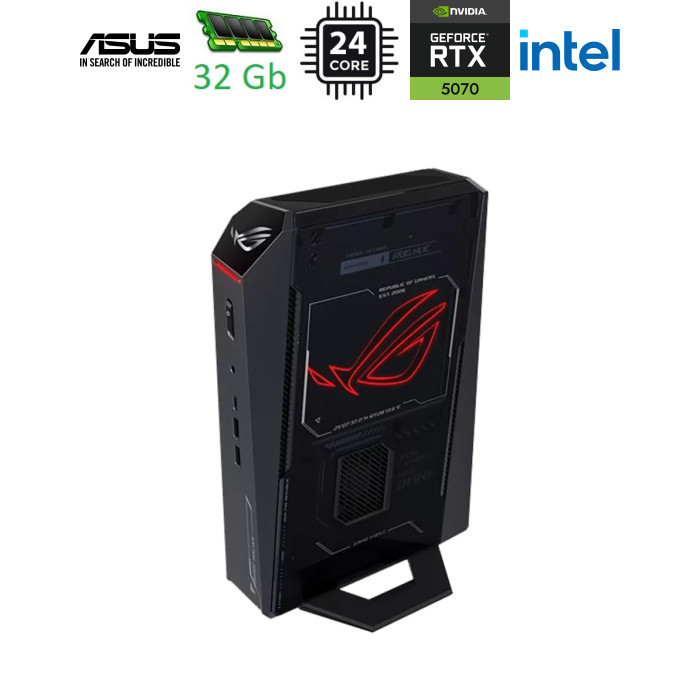ROG NUC (2025) — ультракомпактний ігровий ПК об'ємом лише 3 л, що поєднує потужність флагманських компонентів із продуманим охолодженням та надійним корпусом. Оснащений процесором Intel Core Ultra 9 275HX із 24 ядрами і 24 потоками, базовою частотою 2.1 ГГц та Boost до 5.4 ГГц, він забезпечує неймовірну швидкість для найвимогливіших ігор та ресурсоємних завдань. Графічна потужність від NVIDIA GeForce RTX 5070 Laptop GPU з 8 ГБ відеопам'яті гарантує живописну та плавну графіку в динамічних ігрових сценаріях, підтримуючи VR-технології для повного занурення у віртуальну реальність. Підтримка до чотирьох 4K-дисплеїв відкриває нові сценарії роботи та стримінгу.
