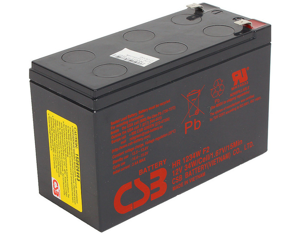 | Акумуляторна батарея для джерела безперебійного живлення є невід'ємним елементом, завдяки ній, устаткування продовжує працювати при відключеній електроенергії. Акумуляторні батареї вбудовуються в ДБЖ і практично не вимагають ніякого обслуговування. CSB (HR1234W) - це свинцево-кислотна, не обслуговуюча батарея з номінальною напругою 12В і місткістю 9 Ач. Також ця батарея характеризируется низьким уровенем саморазряду. Призначення: джерела безперебійного живлення, централі охоронні сигналізації. Залежно від функціонування джерела безперебыйного живлення, акумуляторні батареї CSB (HR1234W) при необхідності автоматично заряджаються в будь-який час, коли джерело підключене до мережі. |