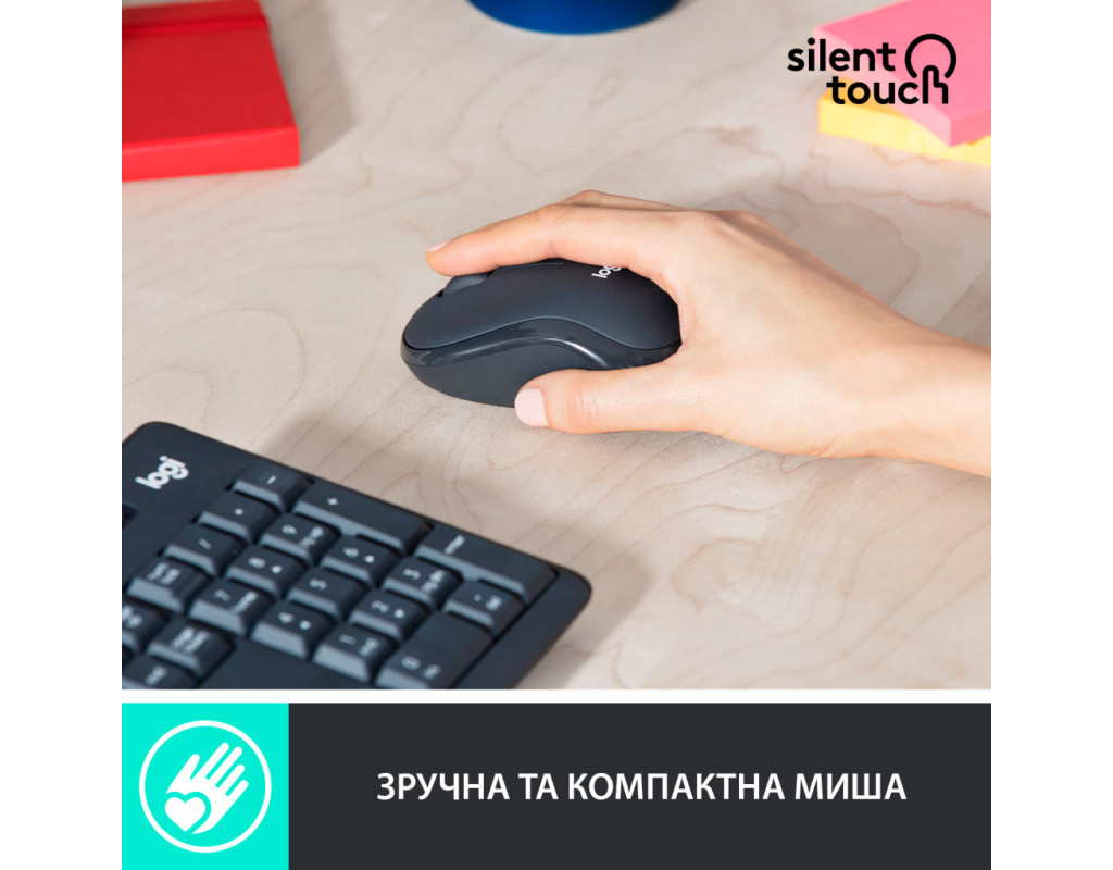 Інноваційна технологія SilentTouch гарантує зниження рівня шуму на понад 90% порівняно з моделлю Logitech MK270. Рівень гучності при введенні тексту та клацанні лівою кнопкою миші виміряний у незалежній лабораторії на відстані 1 м. Шум при роботі не дратує ні вас, ні оточуючих; при цьому зберігається тактильний відгук, до якого ви звикли при роботі з найпопулярнішими комплектами.