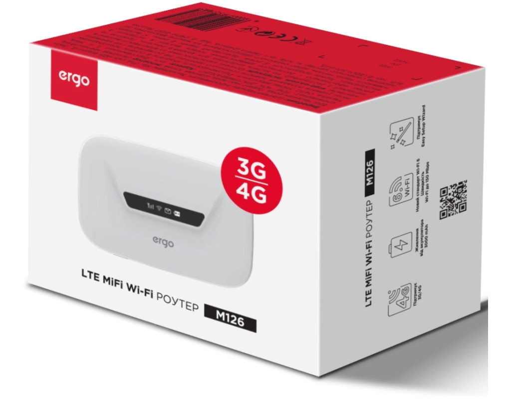 | ERGO M126 – це портативний мережевий пристрій, що поєднує в собі 3G/4G-модем з підтримкою LTE та Wi-Fi-роутер з підтримкою сучасного стандарту WiFi 6. Для доступу до інтернету використовується картка формату nanoSIM будь-якого мобільного оператора. Користувачі можуть підключатися до роутера через мережу Wi-Fi на частоті 2.4 ГГц та зі швидкістю до 287 Мбіт/сек з можливістю під’єднання до 10 пристроїв одночасно. ERGO M126 оснащується вбудованим акумулятором збільшеної ємності 3000 мА*год, та може працювати в автономному режимі до 10 годин. Також можлива робота в режимі живлення через USB-кабель, наприклад, від павербанка або іншого джерела живлення. Це дозволяє організовувати Wi-Fi-мережу з тривалим доступом до інтернету одразу для декількох користувачів |