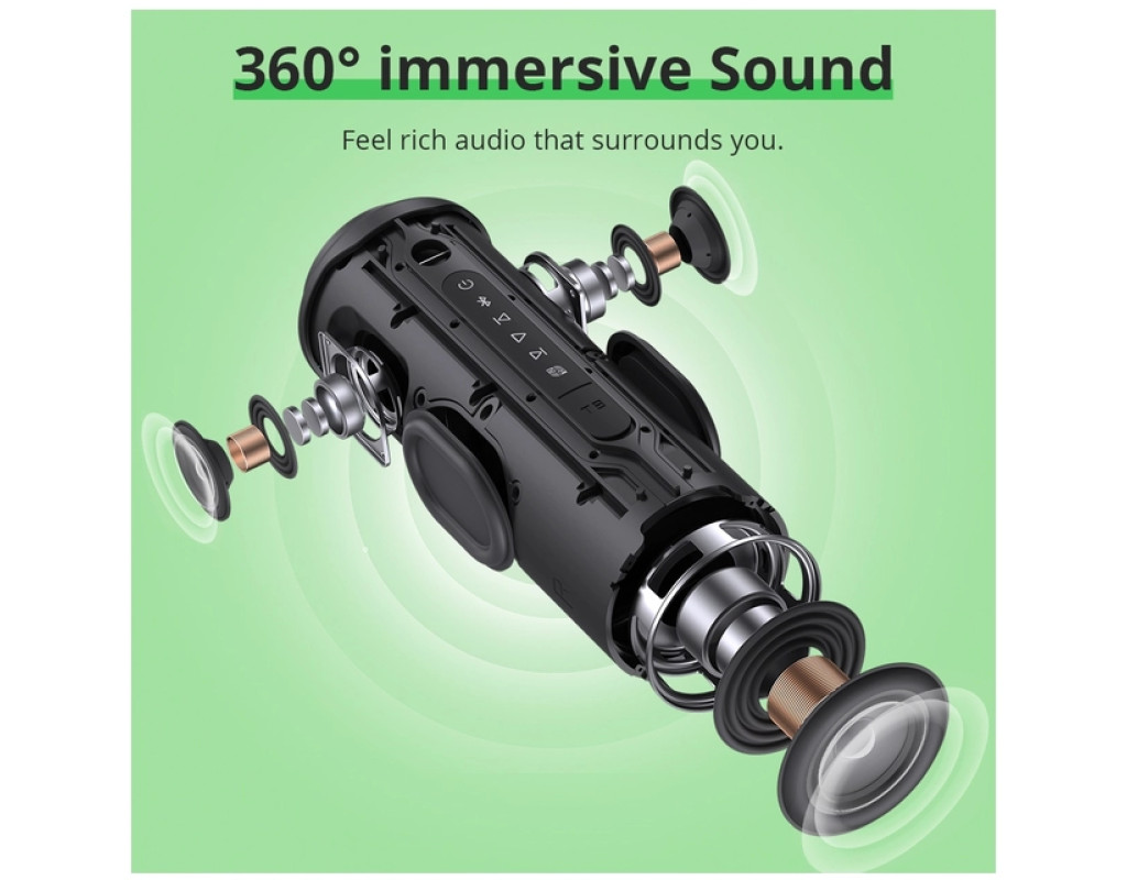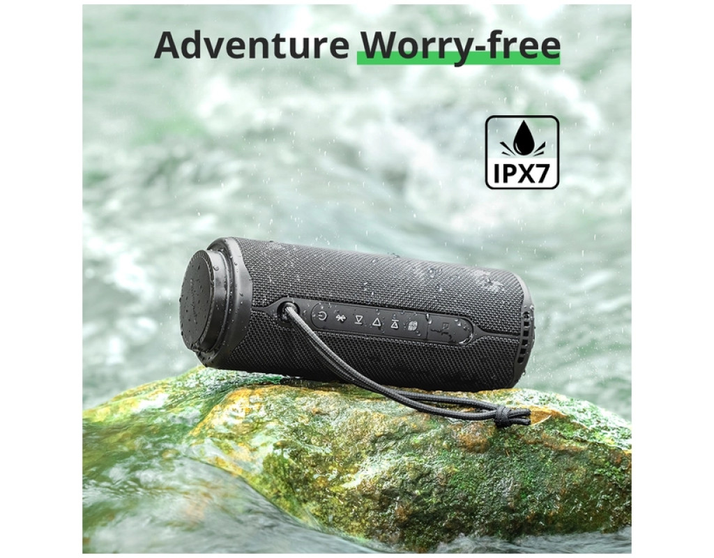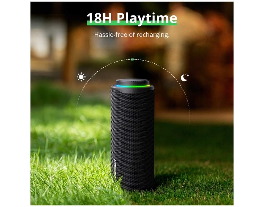 Стійкість до зовнішніх факторів: до 18 годин відтворення та вологозахист IPX7, забезпечуючи стабільну роботу вашої колонки під час бризок та важких подорожей.