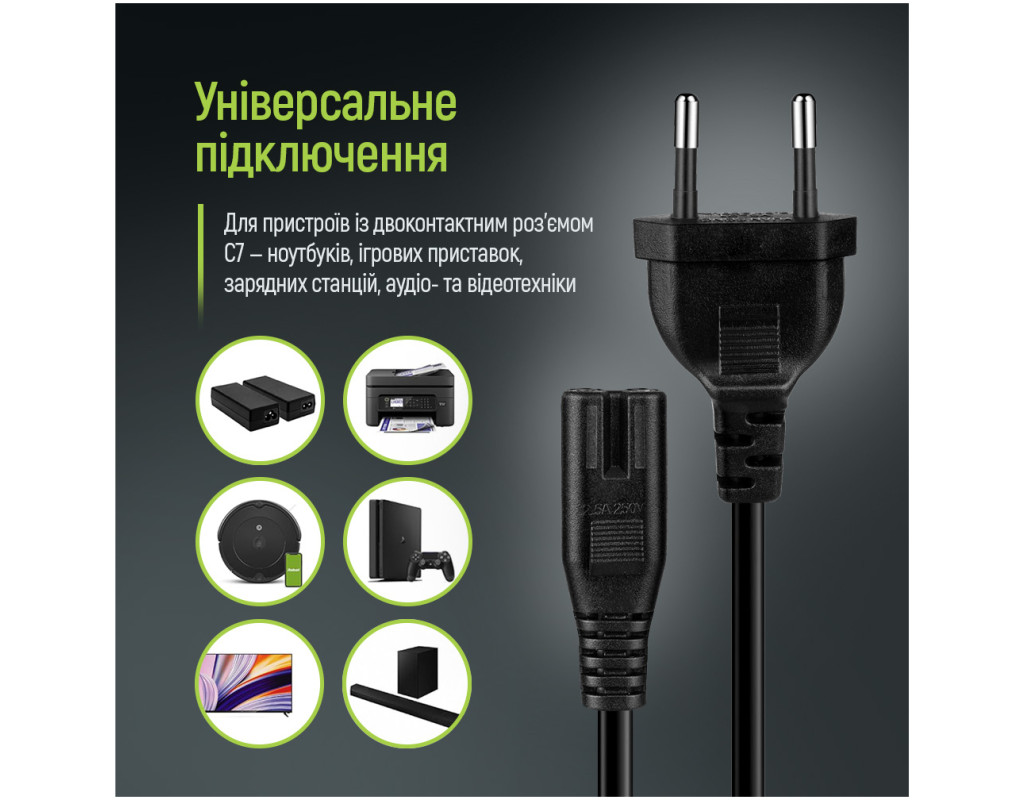 Кабель живлення ColorWay C7 — компактне рішення для підключення техніки з двоконтактним роз’ємом C7 (IEC 60320) до електромережі. Ідеально підходить для ноутбуків, ігрових приставок, зарядних станцій, аудіо- та відеотехніки, а також інших пристроїв, що не потребують заземлення. Міцна ПВХ-оболонка забезпечує захист кабелю від пошкоджень та зносу, а провідник із перетином 2 × 0.5 мм² гарантує стабільну та безпечну подачу електроенергії. Доступний у довжинах 2 та 3 метри для комфортного використання в будь-якому середовищі. Особливості: