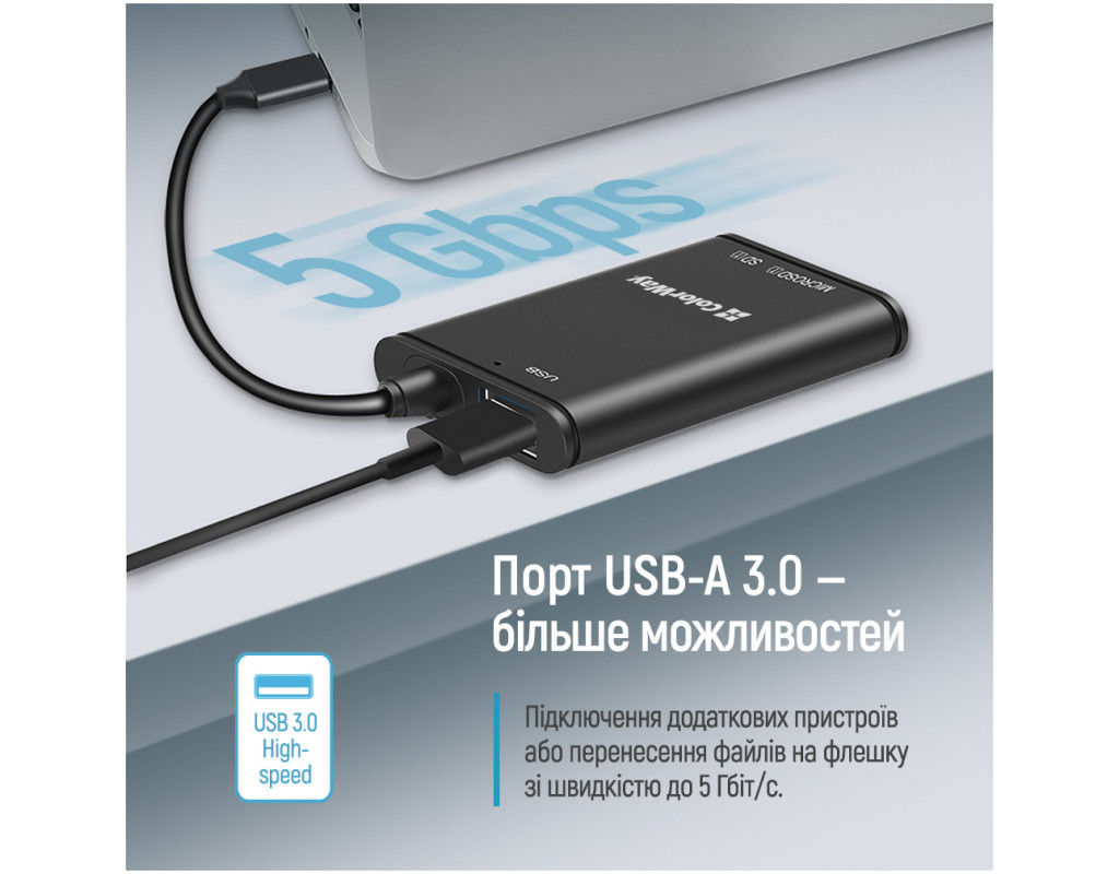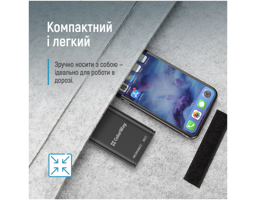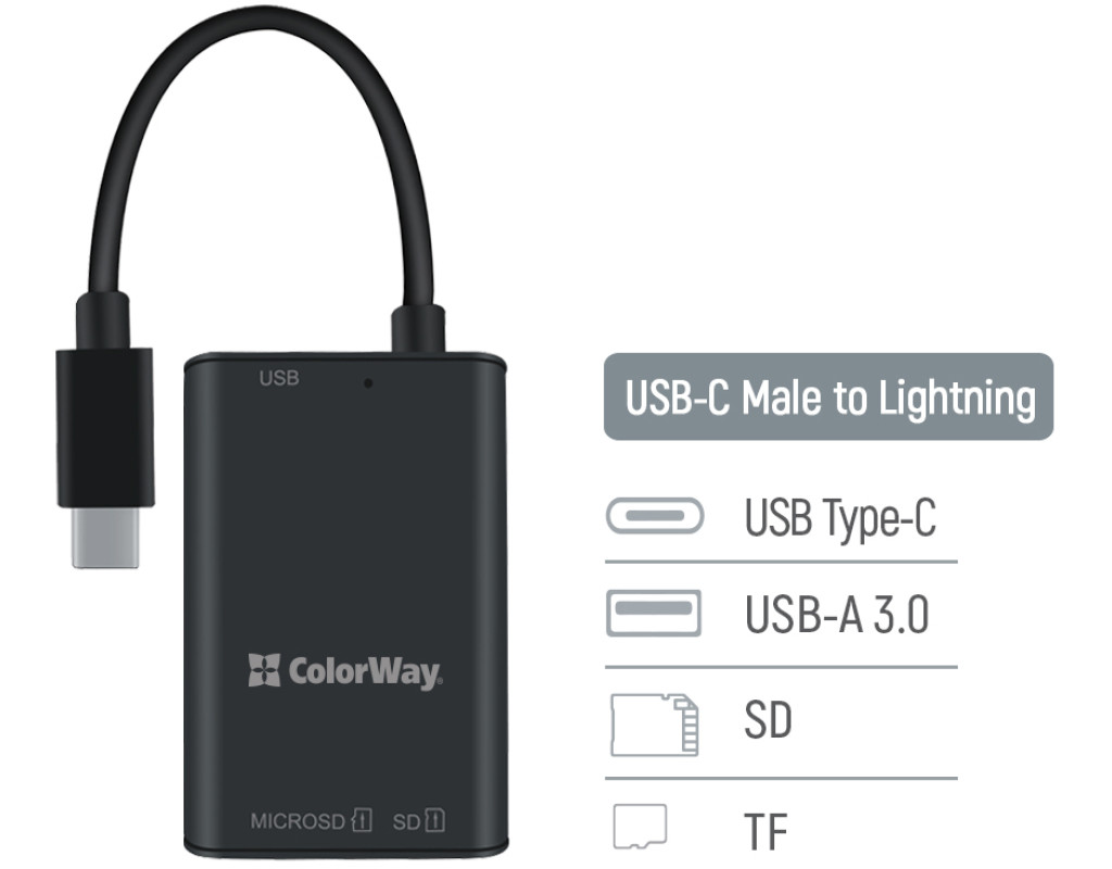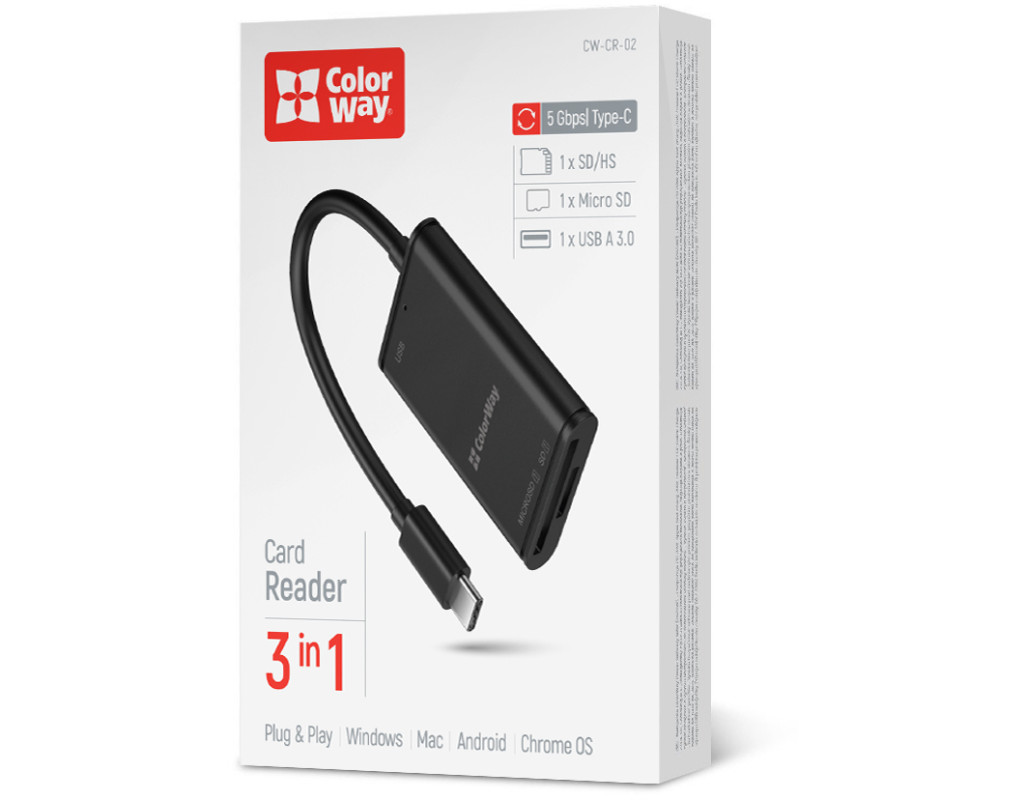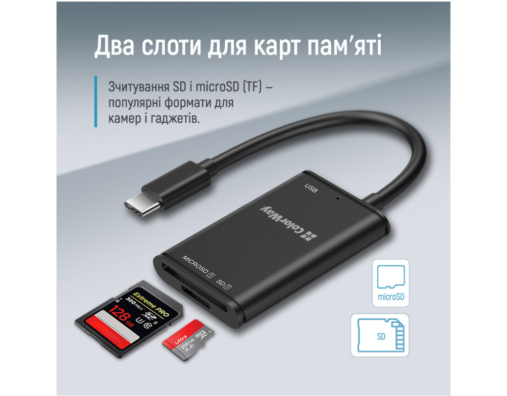 Кардрідер ColorWay USB-C — компактний та універсальний кардрідер призначений для зчитування карт пам’яті SD та microSD (TF), а також оснащений додатковим портом USB-A 3.0 зі швидкістю передачі даних до 5 Гбіт/с. Підключається до ноутбуків, ПК, смартфонів та планшетів із роз'ємом USB-C і підтримкою OTG. Завдяки формату Plug & Play пристрій сумісний із Windows, macOS, Android та Chrome OS без потреби встановлення драйверів. Висувний слот захищає карти від випадкового вилучення, а компактний розмір дозволяє завжди мати кардрідер під рукою. |