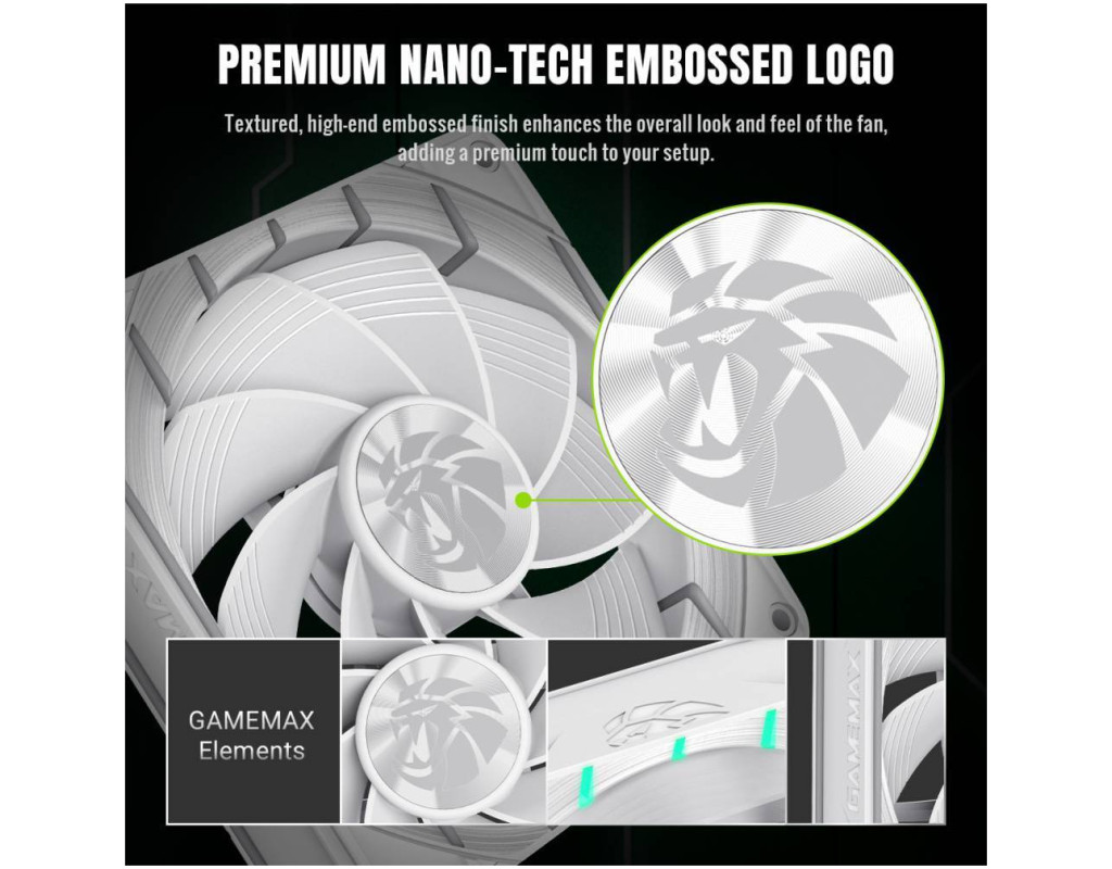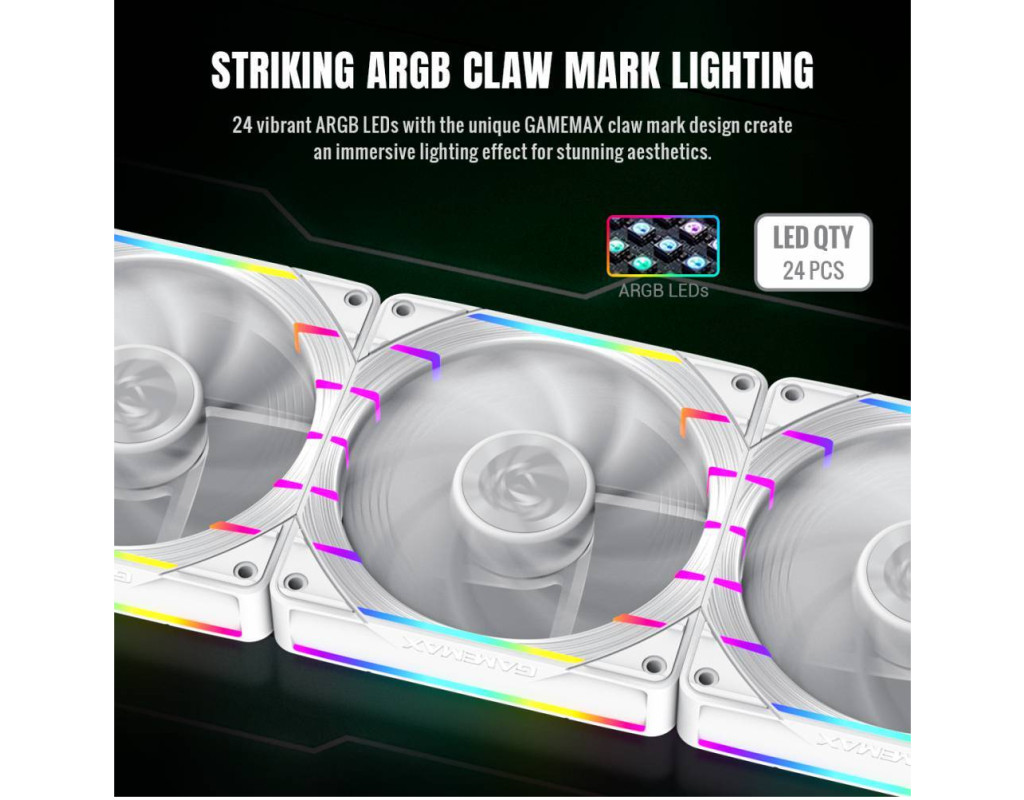 Приголомшливе ARGB-підсвічування: 24 ARGB-світлодіоди створюють унікальний ефект сліду кігтя GameMax. Підтримує синхронізоване регулювання підсвічування з материнською платою, додаючи естетики кіберспорту до вашого корпусу ПК.