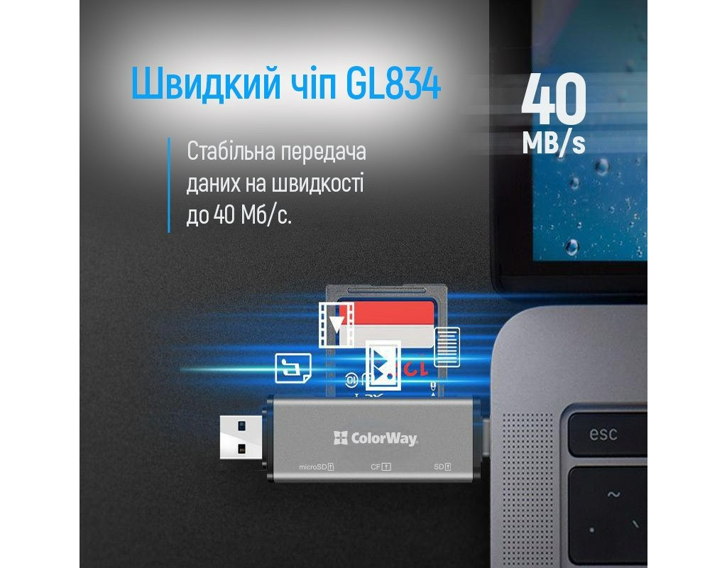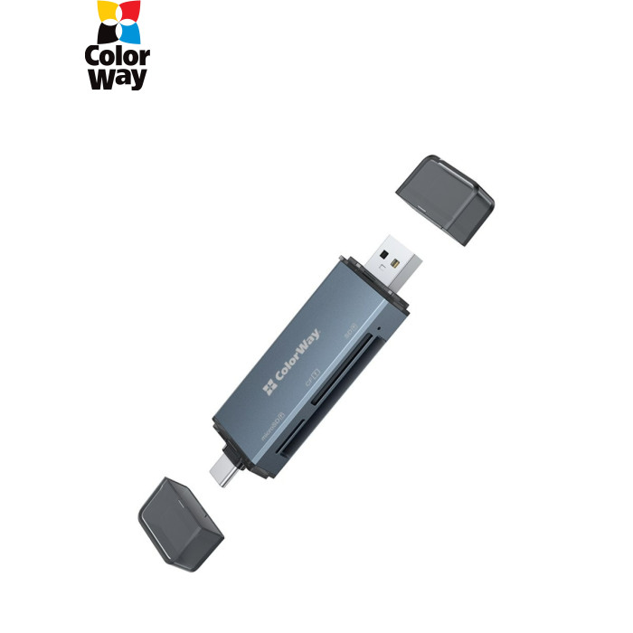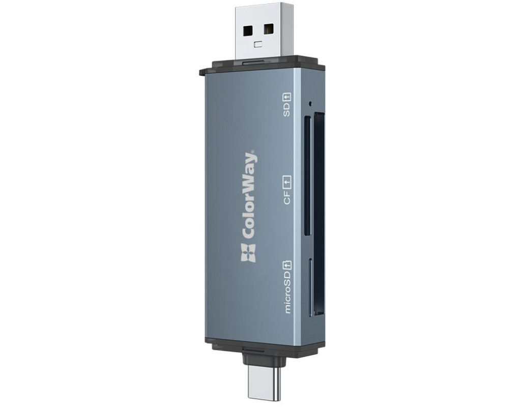 | Кардрідер ColorWay 3-в-1 — компактний та стильний пристрій у формі брелока для зручного зчитування та запису даних з карт пам'яті. Оснащений одразу двома конекторами — USB-C та USB-A — що дозволяє підключати його до ноутбуків, ПК, планшетів і смартфонів із підтримкою OTG. Підтримує карти пам'яті форматів CF, SD та MicroSD (TF) обсягом до 2 ТБ.