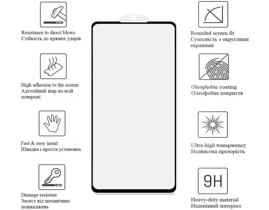 • 9H-твердість матеріалу із загартованого скла посилює стійкість проти ударів та подряпин.