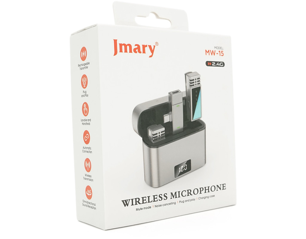 Петличний бездротовий мікрофон Jmary MW-15 (2шт)+ кейс, роз'єм Type-C, вбудований акумулятор 70 mAh, Silver, Box