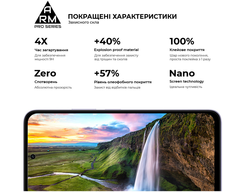 - Верхня частина скла містить покращене олеофобне й гідрофобне покриття. Під час використання скла це забезпечує природні тактильні відчуття - пальці легко ковзають по поверхні. Водночас зображення відбивається з автентичною яскравістю й чіткістю без спотворень.