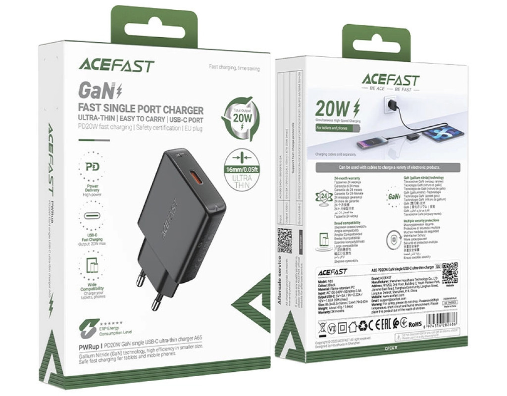 | Зарядний пристрій Acefast A65 USB-C PD20W GaN ultra-thin Black (6974316282686) став справжнім технологічним проривом у світі мобільних аксесуарів завдяки своїм високоякісним характеристикам і унікальному дизайну. Використання технології GaN робить цей адаптер не лише компактнішим, а й енергоефективнішим, забезпечуючи оптимальну подачу енергії з мінімальними втратами та меншим нагріванням порівняно з традиційними моделями. Це дозволяє заряджати ваші пристрої без зайвих турбот щодо безпеки та ефективності. Acefast A65 оснащений вихідною потужністю 20 Вт і підтримує швидку зарядку Power Delivery, завдяки чому зарядка смартфонів, планшетів, фітнес-браслетів, смарт годинників, TWS навушників, екшн-камер та інших ґаджетів відбувається швидко та безпечно. Його USB Type-C порт забезпечує універсальність підключення. Корпус пристрою виготовлений із високоякісного вогнетривкого пластику (PC), що гарантує надійність та безпечність у повсякденному використанні. Окрім цього, його компактність та легкість (розміри 86.3 х 45.5 х 16 мм, вага 47 г) дозволяють зручно транспортувати зарядний пристрій у будь-яку подорож, не займаючи зайвого місця у вашому багажі. Acefast A65 відповідає міжнародним стандартам CE, RoHS, EAC, ERP6, що підтверджує його екологічність та безпеку використання для Android та iOS пристроїв. Це пристрій, на якому можна покластися, гарантуючи довговічність та стабільну роботу без перегріву. Обираючи Acefast A65, ви робите вигідну інвестицію у якість та ефективність, яка відповідає найвищим стандартам сучасних технологій. |