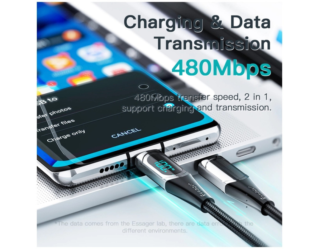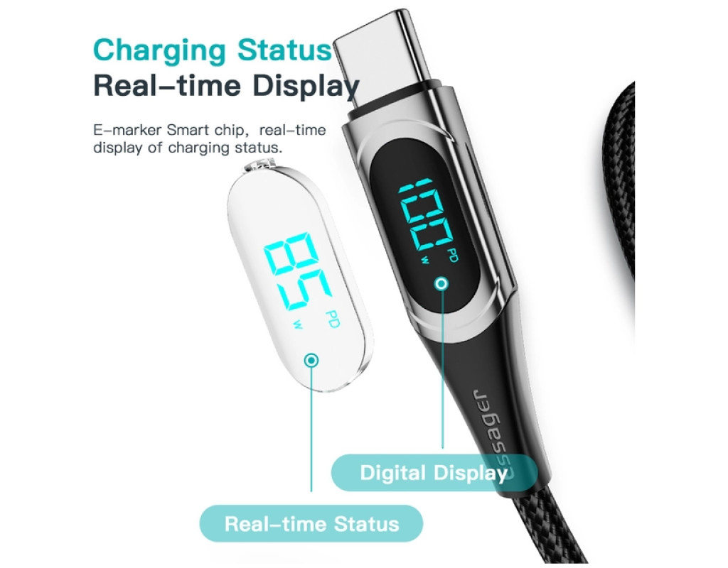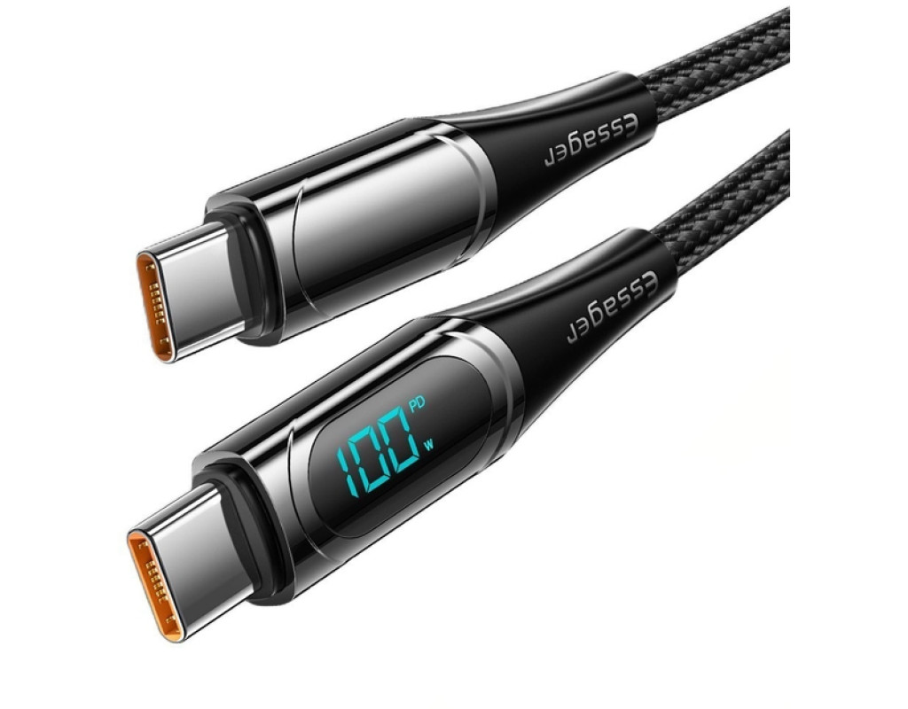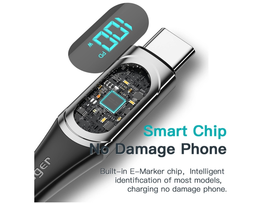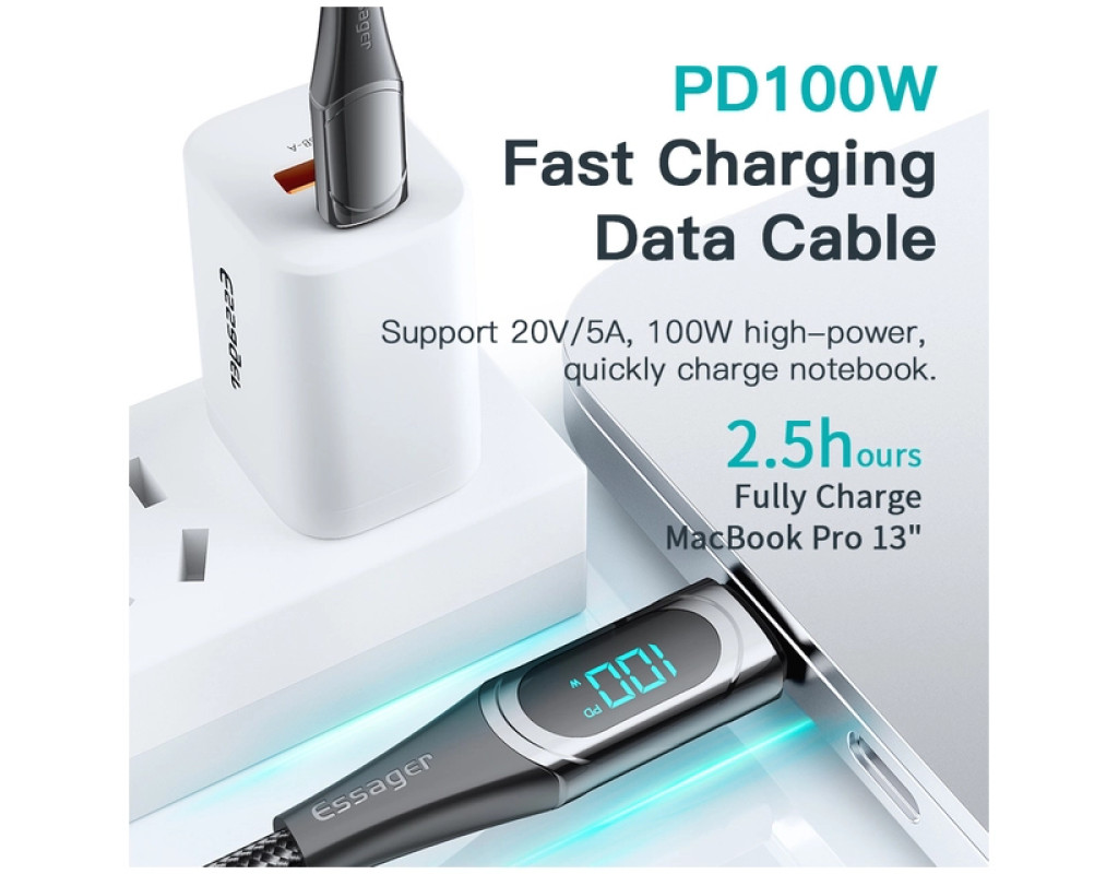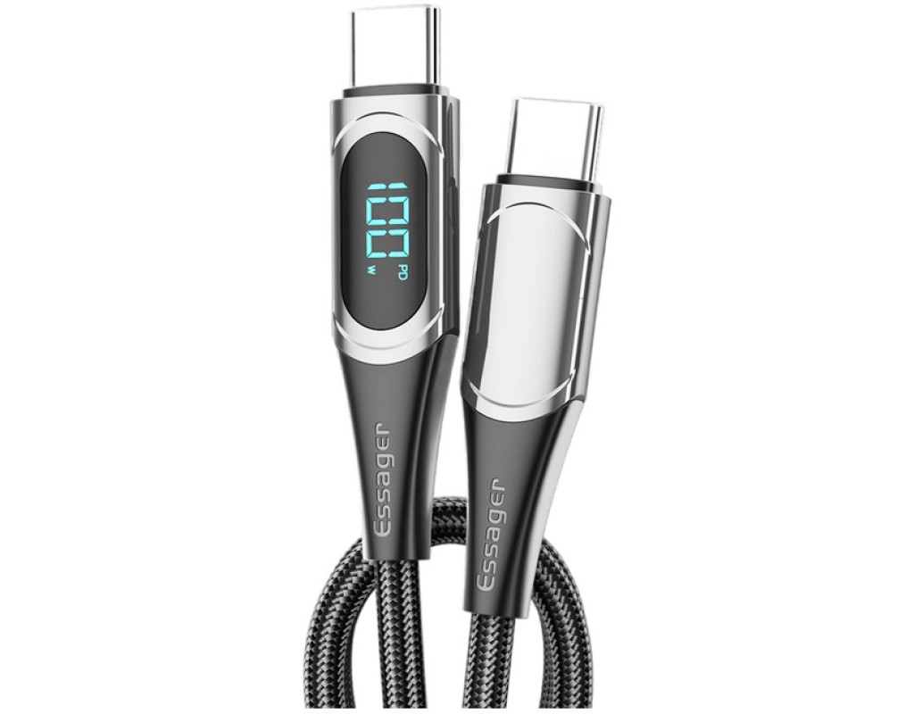 | Кабель для швидкого заряджання Essager Type C x Type C має вбудований чіп E-Mark, який інтелектуально визначає протокол заряджання для мобільних телефонів, комп'ютерів, планшетів, геймпадів. І забезпечує потужність 18 Вт/30 Вт/45 Вт/60 Вт/65 Вт/96 Вт/100 Вт відповідно до найвищого протоколу зарядки, що підтримується пристроєм. Чип E-Mark забезпечує найшвидшу та найбільш підходящу продуктивність для пристрою та гарантує безпеку пристрою. Повністю заряджайте MacBook Pro за 1.8 години так само швидко, як і з оригінальним кабелем живлення. Кабель для швидкого заряджання PD потужністю 100 Вт є ідеальною заміною або запасним кабелем для ноутбуків/телефонів з роз'ємами USB-C/Thunderbolt 3. Світлодіодний екран: Екран цифрового дисплея показує поточну вихідну потужність під час заряджання пристрою в режимі реального часу. Він не тільки дозволяє вам бачити робочий стан системи заряджання, але також дозволяє вимірювати ефективність зарядного пристрою та акумуляторів. Кабель Essager у нейлоновому обплетенні преміум-класу з роз'ємом, посиленим цинковим сплавом, забезпечує довгий термін служби та відсутність заплутування. Конструкція із захистом від натягу та міцний алюмінієвий екран роблять кабель міцним та надійним. Особливості кабелю Essager: