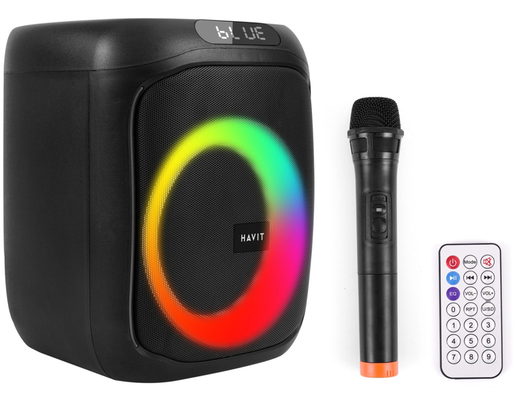 Портативна колонка HAVIT SQ146BT 60W RGB має велику потужність 60W, завдяки чому видає гучний звук, що робить її ідеальною для використання не тільки в приміщенні, а й у відкритих просторах. Чудово передає баси. Сумісна з AUX, USB, FM, BT, TWS, TF, LED, RGB, MIC IN. Має функцію Еквалайзер «EQ», що дозволяє налаштовувати звучання під свій смак. Оснащена LED-дисплеєм. Колонка може працювати як в дротовому, так і бездротовому режимі. Щоб увійти в дротовий режим, достатньо підключити до неї аудіо кабель з роз’ємом AUX. Завдяки колонці можна відтворювати аудіо з USB-накопичувача та карти пам'яті Micro SD. Також вона може працювати в режимі радіо (FM). Суттєвою перевагою даної моделі є можливість підключення до неї 2 дротових мікрофони, що дозволяє використовувати її для виступів і живого виконання, а ще в комплекті йде один бездротовий мікрофон. На верхній частині корпусу присутні кнопки, за допомогою яких ви можете налаштовувати звук під ваші уподобання: регулювати баси та високі частоти, додавати ехо, регулювати гучність колонки та мікрофону. Ще однією особливістю даної моделі є наявність RGB підсвітки. Управляти функціями колонки можна як за допомогою кнопок на верхній частині корпусу, так і за допомогою пульта дистанційного керування, який йде разом з колонкою в комплекті. Колонка заряджається за допомогою кабелю USB-C, який йде в комплекті. Розмір колонки становить 300x255x245мм. В комплект разом із колонкою входить пульт дистанційного керування, бездротовий мікрофон, зарядний кабель, аудіо кабель (AUX) та документація. |