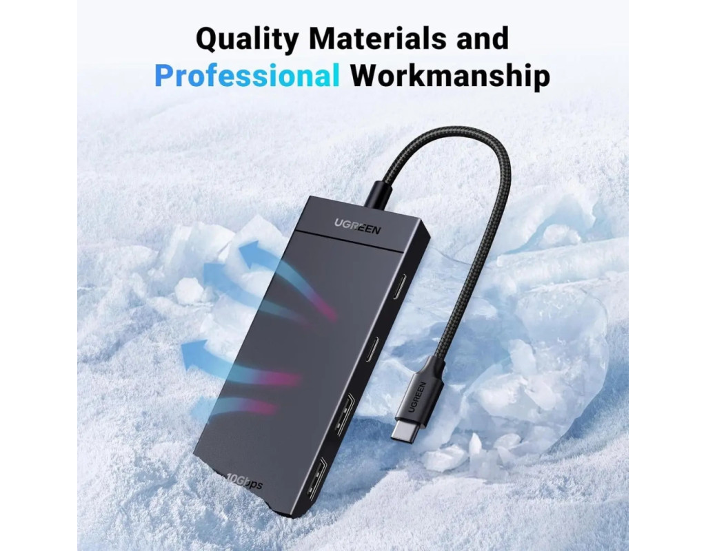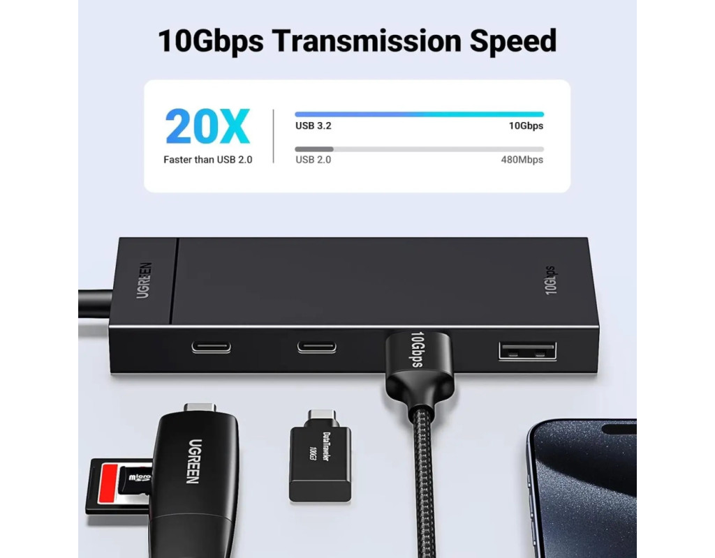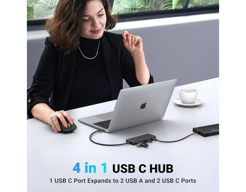 4-портовий USB-C хаб Оснащений двома типами портів — USB-C і USB-A, що задовольняють різні потреби користувача. За його допомогою можна розширити порт USB-C на ноутбуці або ПК до 2 портів USB-C 3.2 і 2 портів USB-A 3.2. Це дозволяє одночасно підключати до чотирьох USB-пристроїв — флешки, жорсткі диски, миші, клавіатури тощо.