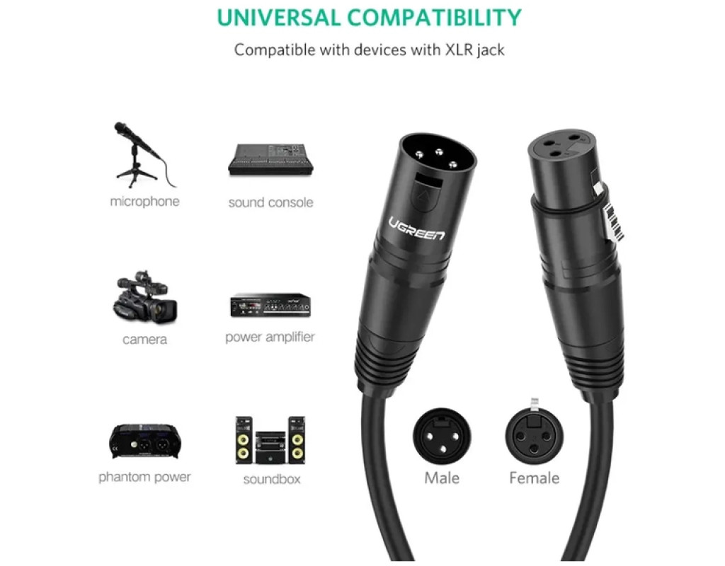 Кабель Ugreen AV130 XLR Male to Female Microphone Cable призначений для приєднання мікрофона до підсилювача або медіаплеєра. Використання якісного матеріалу під час виробництва кабелю забезпечує дуже чітку звукову провідність. Характеристики: