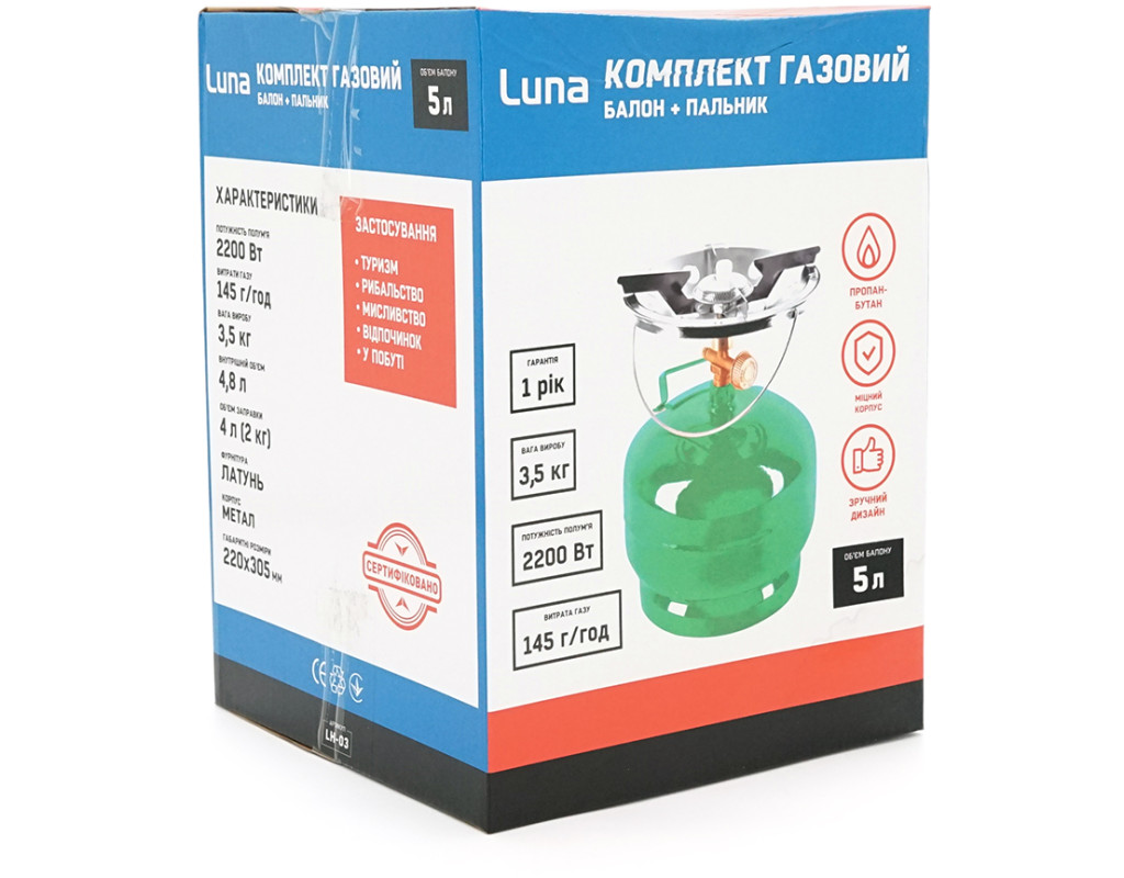 Газовий балон GL-5 2кг(5л), тиск 18BAR + пальник 20354, Green, Q4