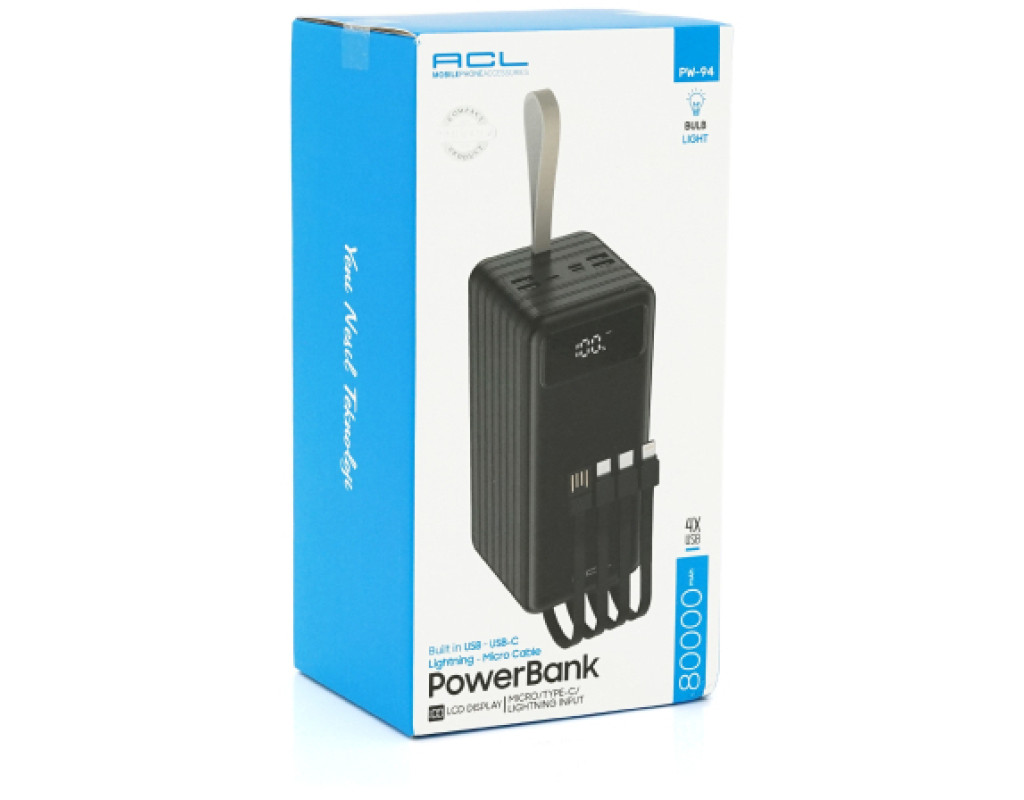 Powerbank ACL PW-94 - це потужний зовнішній акумулятор з ємністю 80000 мАг, призначений для заряджання різних пристроїв, включно зі смартфонами, планшетами та іншими гаджетами. Він оснащений чотирма USB-портами і поставляється з чотирма кабелями (USB, Micro-USB, Type-C і Lightning), що забезпечує широку сумісність з різними пристроями. |