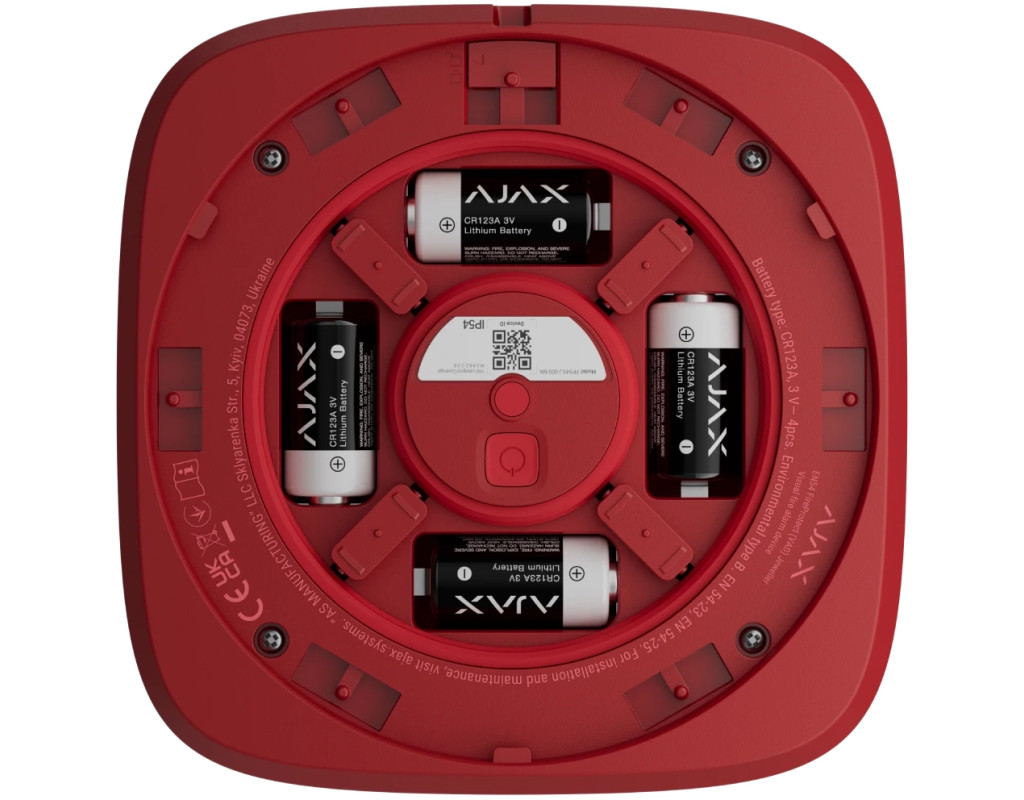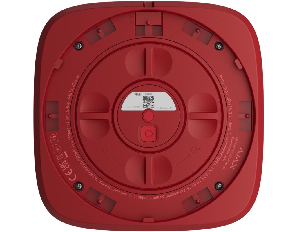 Ajax EN54 FireProtect VAD Jeweller — це бездротовий адресний візуальний пожежний оповіщувач (Visual Alarm Device), сертифікований за стандартами EN 54-23 та EN 54-25. Пристрій забезпечує ефективне візуальне сповіщення про пожежу, що є критично важливим у шумних приміщеннях або для людей із порушенням слуху. Після отримання сигналу тривоги від системи, VAD активує червону LED-рамку, яка блимає з частотою 0,5 Гц відповідно до вимог EN 54-23. Сповіщення активується протягом 3 секунд після пожежного тригеру, гарантуючи своєчасне інформування людей у приміщенні. Комунікація відбувається через захищений радіопротокол Jeweller на частоті 868 МГц. Дальність стабільного зв’язку сягає до 1700 м у відкритому просторі. Пристрій підтримує моніторинг стану: низький заряд батареї, втрату зв’язку, активацію tamper-кнопки та інші несправності, передаючи ці дані до центрального приладу або системи моніторингу. Пристрій працює від батареї CR123A з терміном автономної роботи до 5 років при інтервалі опитування 36 секунд. Додаткова резервна батарея CR2032 підтримує функцію tamper у разі повного розряду основного елемента живлення. Монтаж здійснюється за допомогою кронштейна SmartBracket без необхідності розбирання пристрою. Додавання до системи відбувається через QR-код та мобільний додаток. LED-індикація дозволяє швидко перевіряти статус пристрою. |