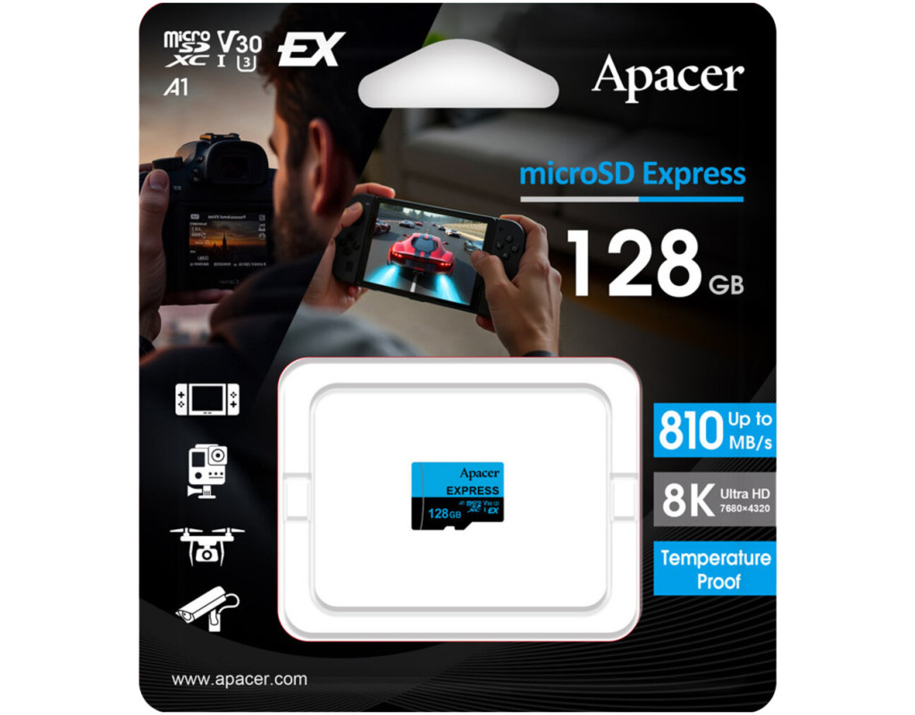 | Карта пам'яті Apacer 128GB microSDXC class 10 UHS-I U3 V30 A1 Express (AP128GMCEXG3X17-RA) – це втілення швидкості та надійності для сучасних технологічних пристроїв. Завдяки передовим технологіям PCle та NVMe, ця карта долає обмеження традиційних microSD, забезпечуючи вражаючу швидкість читання до 800 МБ/с і запису до 700 МБ/с. Вона є ідеальною для важких завдань, таких як 4K/8K відеозйомка, якісна серійна зйомка у форматі RAW, а також для геймінгу та створення контенту. Карта сумісна з портативними консолями і Switch 2, пропонуючи користувачам плавність та задоволення від роботи зі швидкими даними. Об'єм у 128 ГБ забезпечує місцем для безлічі файлів, а різноманітні захисти, включно з водою, ударами та екстремальними температурами, гарантують безпеку ваших даних. Apacer 128GB microSD Express – це ваш надійний компаньйон у світі високих технологій, здатний відповідати вимогам штучного інтелекту та IoT. Насолоджуйтесь неймовірною потужністю та бездоганною функціональністю цієї карти пам'яті. |
