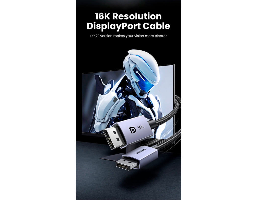 | Кабель UGREEN 16K Displayport 2.1 Підтримує високі роздільні здатності 16K при 30 Гц, 8K при 60 Гц, 5K при 60 Гц, 4K при 60 Гц/120 Гц/144 Гц, 2K при 15 Гц/240 Гц. І назад сумісний із DisplayPort 1.4, 1.3, 1.2. Одноекранний відеовихід 16K при 60 Гц (DSC), 10K при 60 Гц та подвійний екран 8K при 120 Гц, 4K при 144 Гц, триекранний дисплей для 10K при 60 Гц, 4K при 90 Гц. Сертифікований кабель DisplayPort 2.1 Цей кабель DisplayPort 2.1/2.0 забезпечує безпрецедентну пропускну здатність 80 Гбіт/с, що майже втричі більше, ніж у попередній специфікації DP 1.4, а також стабільну та швидку передачу без втрати сигналу. Примітка. Він обернено сумісний з попередніми стандартами DP 1.4 і DP 1.2. Оптимізований для любителів ігор Високоякісний кабель DisplayPort 2.1 настійно рекомендується для ігрових систем, оскільки він добре працює з ігровими моніторами та відеокартами та передає високоякісні відео- та аудіосигнали без затримок та перешкод. Він також підтримує Freesync та G-Sync, які необхідні для ігор. Dynamic HDR також може оптимізувати темне зображення у грі та покращити деталізацію, особливо у шутерах від першої особи. Наднадійність Кабель UGREEN DP 2.1 має потрійне екранування та жерсть, має високу стійкість до електромагнітних перешкод. Корпус із цинкового сплаву стійкий до іржі та прискорює відведення тепла. Він має міцну плетену нейлонову оболонку, яка в 10 разів міцніша за ПВХ. Витримує термін служби понад 16 000 вигинів. Це може забезпечити вищу можливість підключення передачі сигналу. Широка сумісність Кабель UGREEN DisplayPort — DisplayPort сумісний з усіма пристроями з портами DisplayPort. Сумісний з відеокартами Nvidia RTX 3070/RTX 3080/RTX 3090 та AMD Radeon RX 6800/6900. Відеокарти 00/6900, HDTV, Fire TV, комп'ютери та інші. Підтримує режими DP, DP++ та DisplayPort++, зворотна сумісність 1.4/1.3/1.2. |