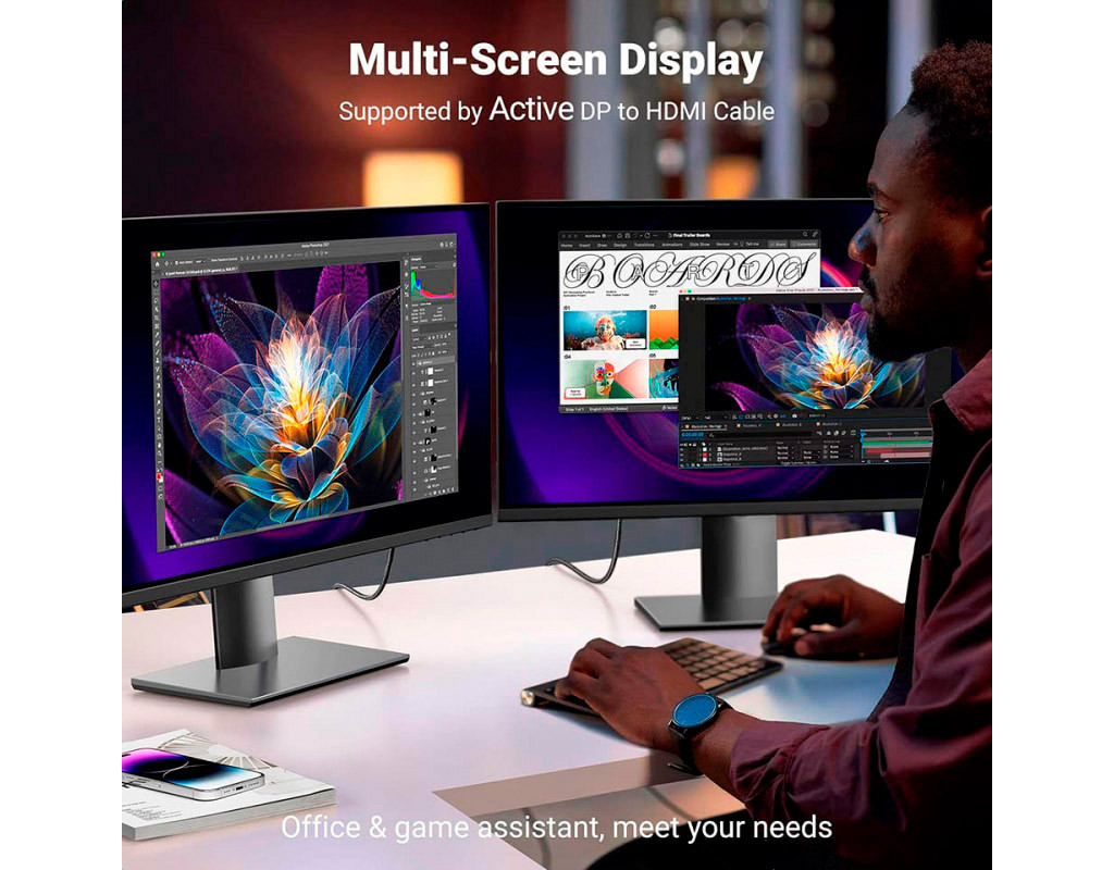 Роздільна здатність 4K-60 Гц UHD Кабель DisplayPort to HDMI підтримує роздільну здатність до 4K-60 Гц (зворотна сумісність із 2K-60 Гц та 1080P-120 Гц) і дарує реалістичні відчуття від перегляду 3D-контенту. Завдяки підтримці HDR зображення стають яскравішими, кольори насиченішими, а контрастність вищою порівняно зі звичайним цифровим відео. Кабель відповідає стандарту HDMI 2.0, тому кінцева глибина кольору, формат та роздільна здатність залежать від налаштувань ПК, кабелів та моніторів. Активне розширення на кілька екранів Як активний кабель DisplayPort-HDMI, він підтримує режим Eyefinity Multiple Screen SLS і технологію AMD Eyefinity multi-display, що дозволяє підключати до 6 екранів одночасно. Примітка: це односторонній кабель 4K DP-HDMI. Передача відеосигналу здійснюється лише з DisplayPort у HDMI, а не навпаки. Стабільна передача аудіо та відео Версія DP 1.2 забезпечує передачу даних на швидкості до 18 Гбіт/с і 240 Гц. Стабільний сигнал гарантує чудову якість зображення й звуку без мерехтіння. Підходить для дзеркального або розширеного режиму. Підтримує передачу звуку для незжатих цифрових каналів 7.1, 5.1 або 2 та відео до 4K-60 Гц. Покращені матеріали Плетений нейлоновий кабель забезпечує високу зносостійкість, а розвантаження натягу полегшує підключення. Корпус з алюмінієвого сплаву покращує тепловідведення, а високоякісні роз'єми гарантують безпечну передачу даних без пошкоджень. Товсті мідні провідники забезпечують максимальну провідність і мінімальні втрати сигналу. Універсальна сумісність Сумісний із ноутбуками з підтримкою DisplayPort (HP ProBook EliteBook, ThinkPad), настільними ПК (HP, Dell Optiplex/Precision/XPS), відеокартами (AMD, NVIDIA) та іншими пристроями. Підключайте телевізор із HDMI, проєктор, монітор, VR-гарнітуру або інші пристрої для передачі відео та звуку. Примітка: несумісний з джерелами HDMI, як-от MacBook, PlayStation, Switch і Xbox. Підтримується лише напрямок DisplayPort → HDMI. |