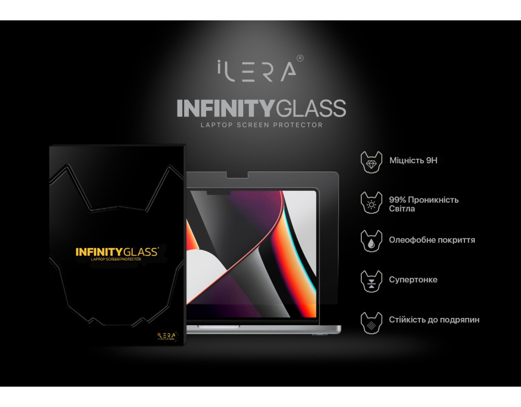 Максимальний захист для вашого MacBook Захисне скло iLera MacBook Glass Screen Protector створене спеціально для збереження ідеального вигляду дисплея вашого MacBook. Воно забезпечує високий рівень захисту від подряпин, потертостей та випадкових пошкоджень, залишаючи екран таким же яскравим і чітким. Чіткість та комфорт Скло має високу прозорість, яка не спотворює кольори та не знижує контрастність. Ви отримуєте природну передачу кольору та комфорт для очей навіть під час тривалої роботи. Практичні переваги