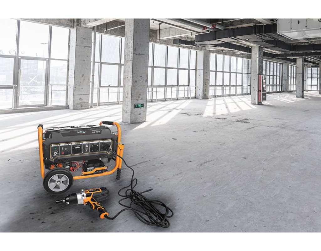 | Особливості Бензиновий генератор Neo Tools потужністю 3 кВт оснащений електростартером і системою стабілізації напруги AVR для захисту підключених пристроїв. Пристрій працює на бензині АІ-92/95/98, має мідну обмотку, бак об’ємом 15 л та економну витрату палива. Конструкція передбачає транспортні колеса, ручки та міцну металеву раму. Набір Neo Tools поєднує бензиновий генератор потужністю 3 кВт із системою стабілізації напруги AVR та портативну сонячну панель потужністю 15 Вт. Це універсальне рішення для живлення побутових приладів, інструментів та електроніки у місцях без доступу до електромережі. Обладнання забезпечує стабільну напругу 230 В та підходить для використання як у побуті, так і на виїзних роботах чи під час відпочинку на природі. Ефективна робота генератораГенератор Neo Tools оснащений чотиритактним бензиновим двигуном потужністю 5.1 кВт (7 к.с.) та електричним запуском. Система AVR автоматично підтримує стабільний рівень напруги, захищаючи підключені пристрої від перепадів струму. Завдяки мідній обмотці, генератор працює стабільно навіть під навантаженням, а датчики рівня оливи та захист від перевантаження підвищують безпеку експлуатації. Продумана конструкціяМіцна металева рама виконує захисну та транспортну функцію, а колеса та складні ручки полегшують переміщення. Генератор обладнаний двома розетками 230 В та виходом 12 В, вольтметром і паливним індикатором. Ємний бак на 15 л забезпечує тривалий час роботи без необхідності дозаправки, а рівень шуму 96 дБ відповідає стандартам Euro V. Технології