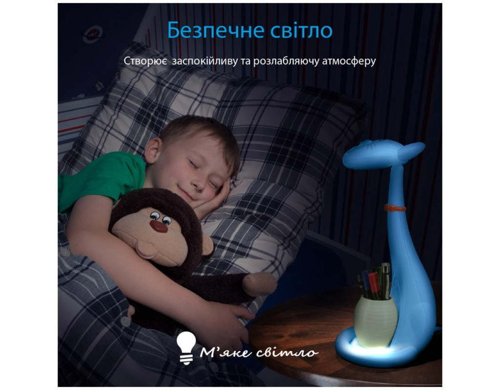 Цей світлодіодний настільний світильник може висвітлити будь-який темний простір у вашому будинку та дати відчуття безпеки вашій дитині. Світло, що випромінюється світлодіодними лампами, нейтральне й захищає дитячі очі від шкідливого впливу. Безпека перевірена й корпус виробу захищений від несанкціонованого доступу, щоб захистити маленькі пальчики. Легко змінювати інтенсивність, теплоту світіння натискаючи сенсорну кнопку на «оці тварини», так що ваша дитина матиме ідеальне світло для своїх занять, читання або відпочинку. Особливості: