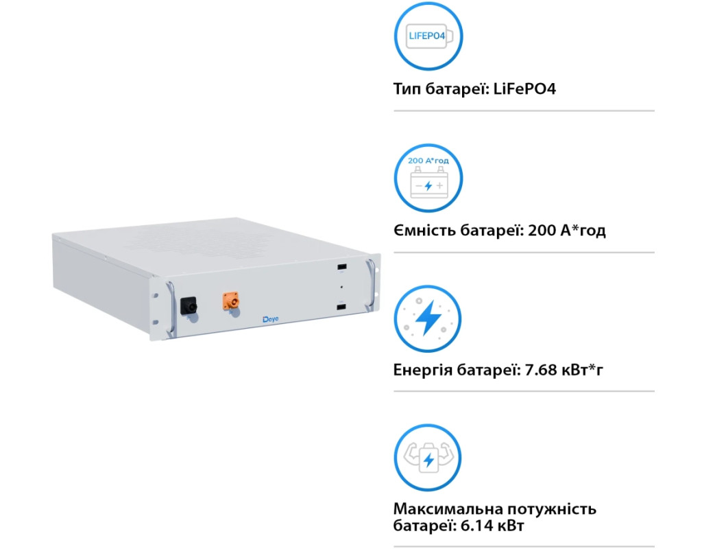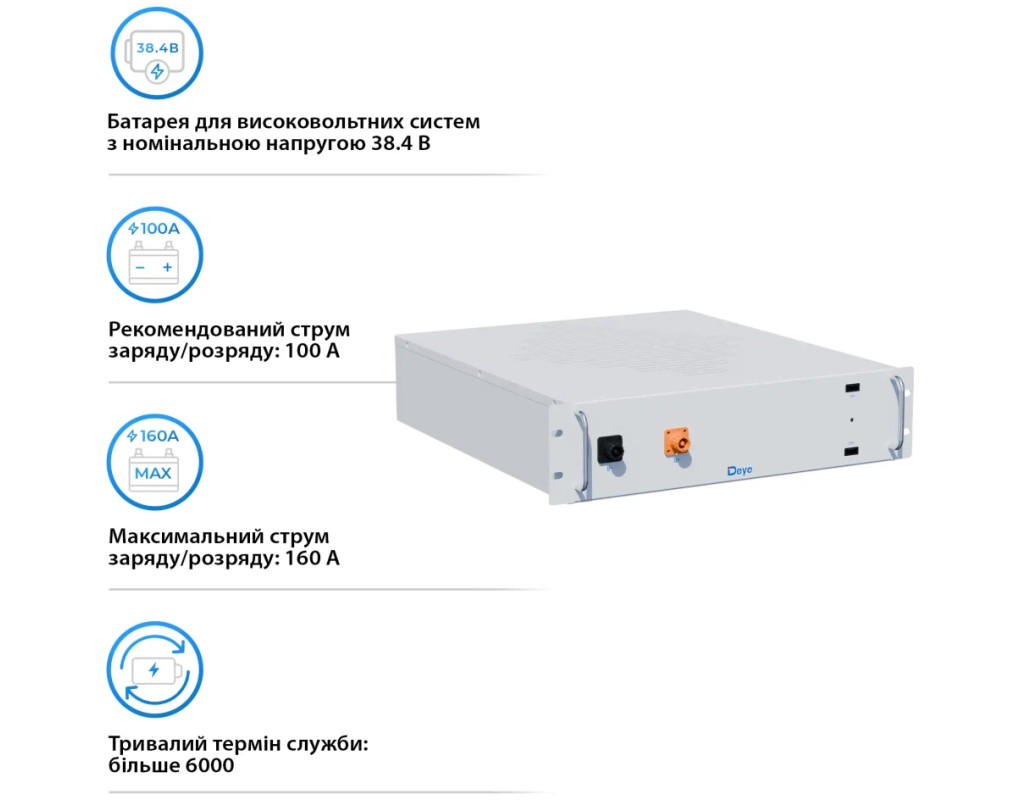 Ефективне рішення для енергозбереження Шукаєте надійну та довговічну батарею для ваших енергосистем? Акумуляторна батарея DEYE BOS-A — це високовольтний пристрій на основі літій-залізо-фосфатної (LiFePO4) технології, яка гарантує стабільну роботу та високий рівень безпеки. Переваги LiFePO4 технології Літій-залізо-фосфатні батареї відзначаються високою безпекою та довговічністю. Цикл життя до 6000 циклів робить цю модель ідеальною для тривалого використання. Технологія LiFePO4 також мінімізує ризик перегріву та займання. Простота інтеграції Акумулятор оснащений власними клемами, що спрощує підключення до різних систем. Пристрій сумісний із більшістю інверторів та систем зберігання енергії. Чому варто обрати акумуляторну батарею DEYE BOS-A? Акумуляторна батарея DEYE BOS-A — це ідеальне рішення для тих, хто шукає надійність та довговічність. Технологія літій-залізо-фосфатних елементів (LiFePO4) забезпечує стабільну роботу та безпеку. Енергоефективність та безпека DEYE BOS-A відрізняється високою енергоефективністю та пасивним охолодженням, що знижує енергозатрати та продовжує термін служби. Металевий корпус забезпечує додатковий захист від зовнішніх впливів. Зручність експлуатації Робочий діапазон температур від -20°C до +55°C робить цю батарею ідеальною для використання в різних кліматичних умовах. Рекомендована температура зберігання — від 0°C до +35°C. |