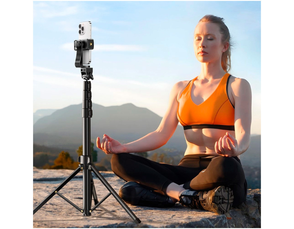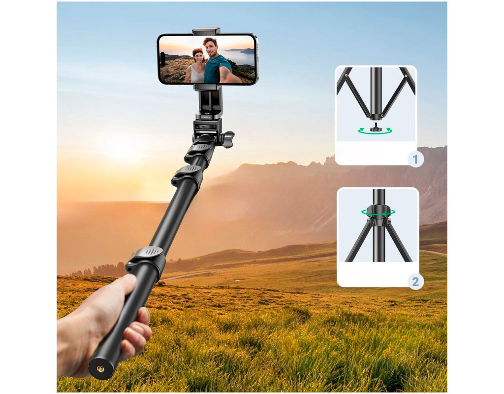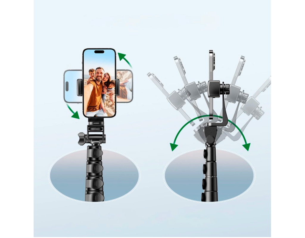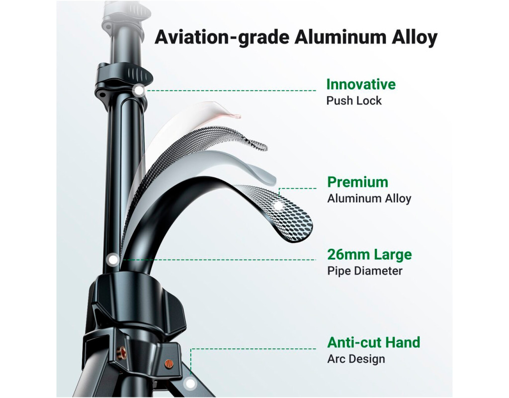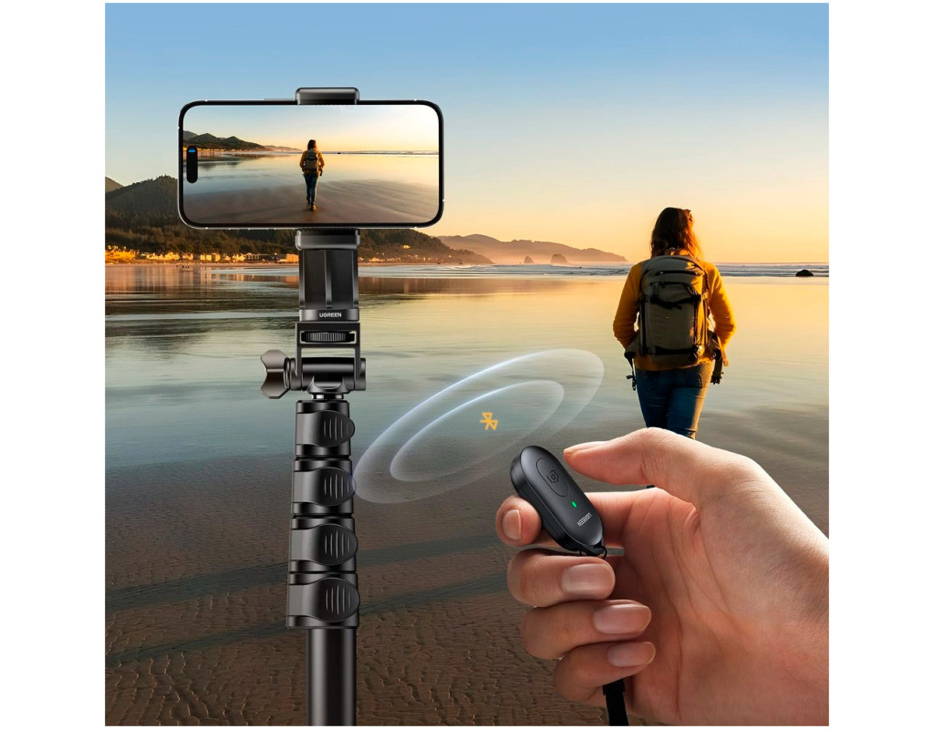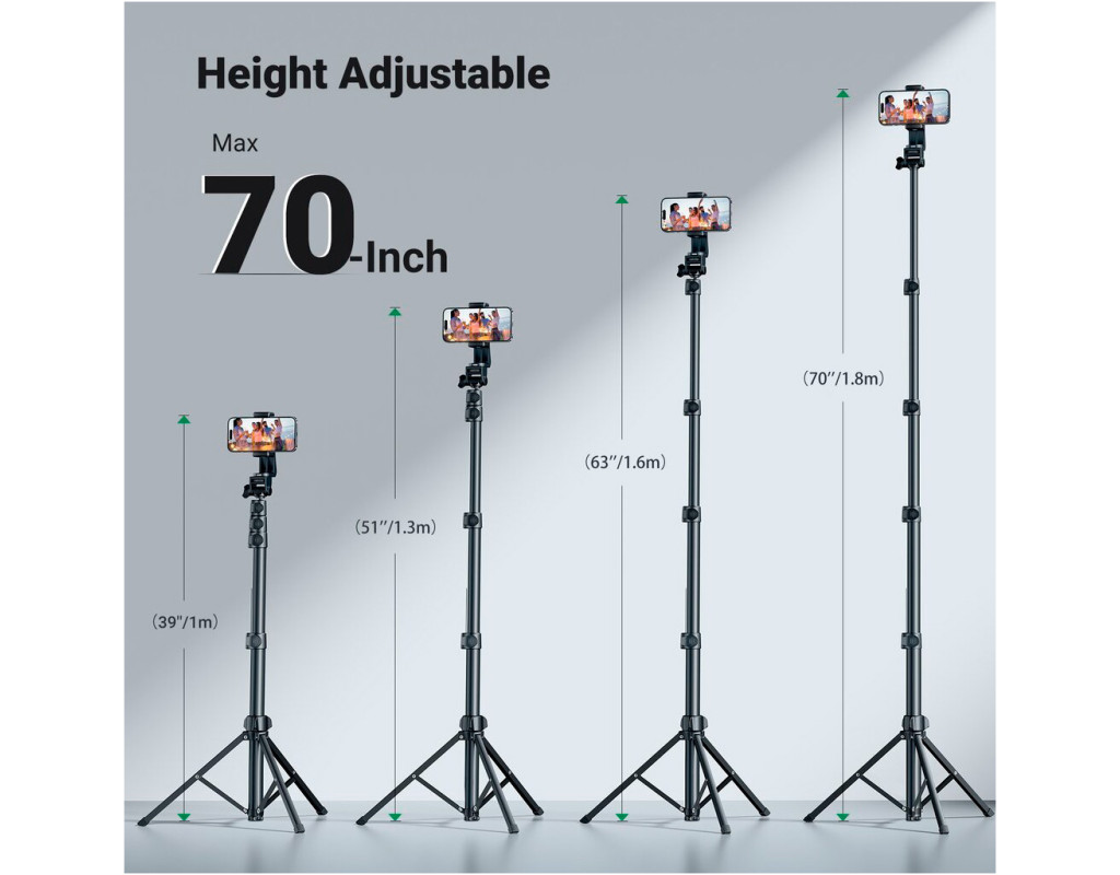 Більш гнучке регулювання висоти Штатив для телефону UGREEN регулюється по висоті в діапазоні від 58 до 166 см і ідеально підходить для стрімінгу в реальному часі, запису відео та фотографування. Примітки Дії з вирівнювання затискача телефону: спочатку прикріпіть затискач телефону, відрегулюйте його в правильне положення, а потім зсуньте кнопку, щоб закріпити затискач. Швидке з'єднання зі справжньою паличкою для селфі Цей тримач для штатива для телефону можна використовувати як подовжену паличку для селфі, яка підходить для фотографування з друзями та родиною. Просто послабте нижній гвинт і вісь обертання штатива, ви зможете витягнути паличку безпосередньо і зробити справжнє селфі, попрощавшись з важкою основою штатива під час зйомки. Міцний з покращеною основою Цей штатив для мобільного телефону відрізняється міцною та надійною конструкцією, тому більше не турбуйтесь про тремтячі або розмиті кадри. Цей металевий штатив для подорожей, оснащений основою довжиною 26 см і антиковзаючими силіконовими накладками, забезпечує відмінну стабільність і безпеку вашого обладнання. Підлоговий штатив для всіх телефонів Цей універсальний тримач для телефону сумісний з телефонами розміром від 4.0 до 7.9 дюйма, iPhone 15 Pro Max, 15 Pro, 15, 14, 14 Plus, 14 Pro, 14 Pro Max, 13 Pro Mini, 12, 11 Pro, XS, Max XR X SE, iPhone 8, 7, 6, 6S Plus, Galaxy S23, S23+, S23 і т. д. Завдяки різьбовому з'єднанню 1/4 дюйма цей портативний штатив також сумісний з GoPro та екшн-камерами. З пультом дистанційного керування Безпровідний пульт дистанційного керування з захистом від втрати браслета дозволяє легко керувати мобільним телефоном на відстані до 10 м, забезпечуючи велику гнучкість і комфорт. |