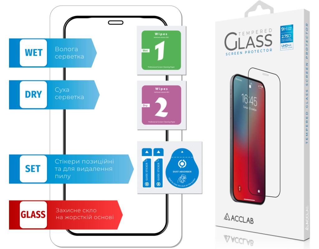 Призначення - для телефону, Вид покриття - захисний, Сумісність з моделями - Apple iPhone 12 Mini, Особливості - міцність: 9 Н, волога серветка, Кількість в упаковці - 1 шт