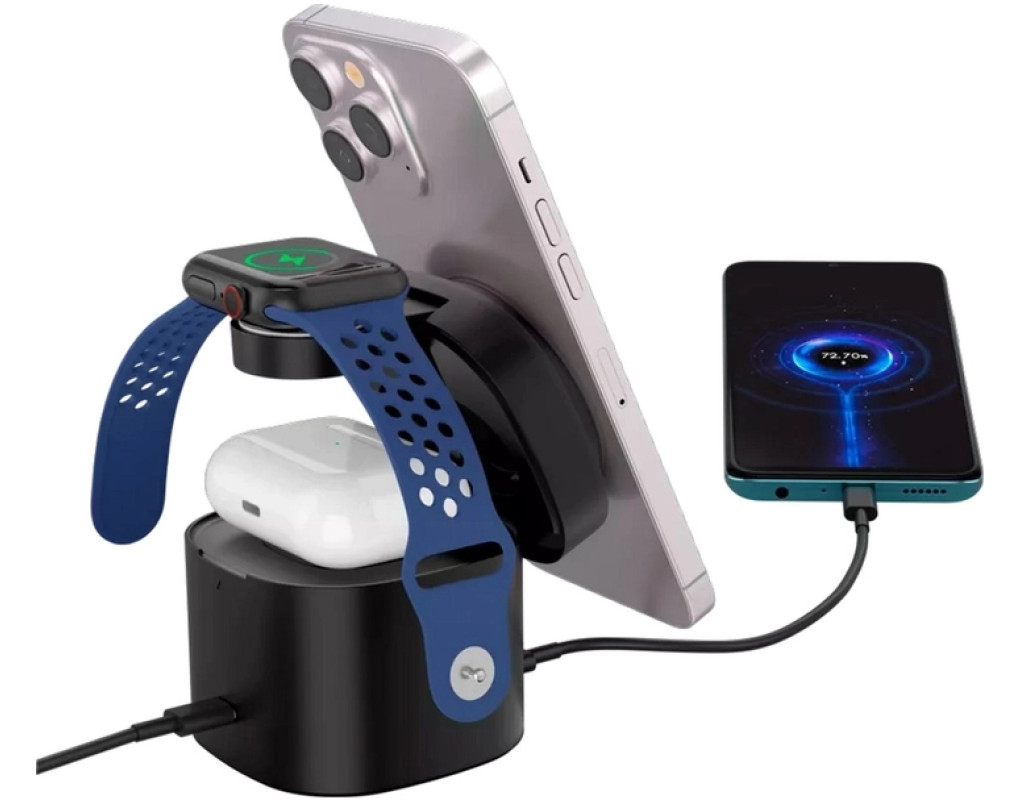 | Зарядний пристрій Canyon 4-in-1 wireless charging stand 30W + cable 1.0m black (CNS-WCS405BW/A) — це інноваційне рішення для тих, хто прагне впорядкувати процес зарядки своїх гаджетів. OnCharge 405 пропонує можливість одночасного заряджання до чотирьох пристроїв: смартфона, Apple Watch, AirPods та додаткового гаджета через USB Type-C. Завдяки швидкій магнітній зарядці потужністю 15 Вт з сертифікацією Qi2, ця підставка гарантовано підтримує ефективну зарядку ваших девайсів без зайвого клопоту. Компактність і потужність — ключові слова, які найкраще описують OnCharge 405. З розмірами всього 70×70×70.3 мм, цей пристрій легко розміщується на столі або тумбочці, підтримуючи порядок у вашому просторі. Вихід USB(C) з потужністю 30 Вт забезпечує швидку дротову зарядку, а підтримка Power Delivery 3.0 та Wireless Fast Charge дозволяють отримати максимум від технології бездротової зарядки. OnCharge 405 пристосована для різних умов завдяки чотирьом рівням захисту від перенапруги, перевантаження по струму, перегріву та коротких замикань, що забезпечує безпеку ваших пристроїв під час заряджання на повній швидкості. Інтерактивна сумісність — ще одна перевага OnCharge 405. Вона бездоганно працює з усіма вашими пристроями, від найновіших iPhone до різноманітних Android-смартфонів, а також fitness-браслетів і TWS-навушників. Завдяки точному магнітному вирівнюванню, ваші пристрої завжди знаходяться в ідеальному положенні для зарядки. Преміальна якість та надійність роблять Canyon OnCharge 405 недооціненим помічником у повсякденному житті, адже він допомагає уникнути безладу з дротами та швидко зарядити всі ваші девайси. Обираючи Canyon, ви робите ставку на передові технології та якість, що дозволить завжди залишатись на зв’язку з максимальним комфортом. |