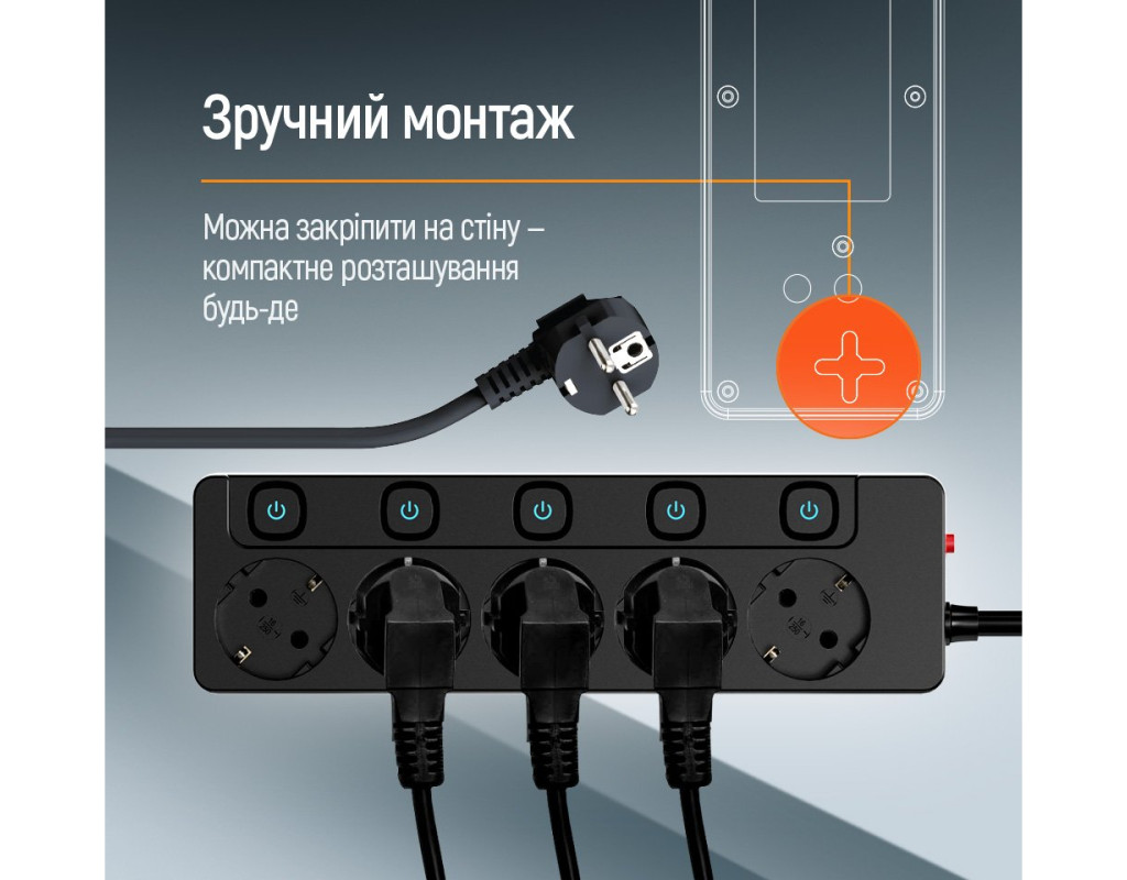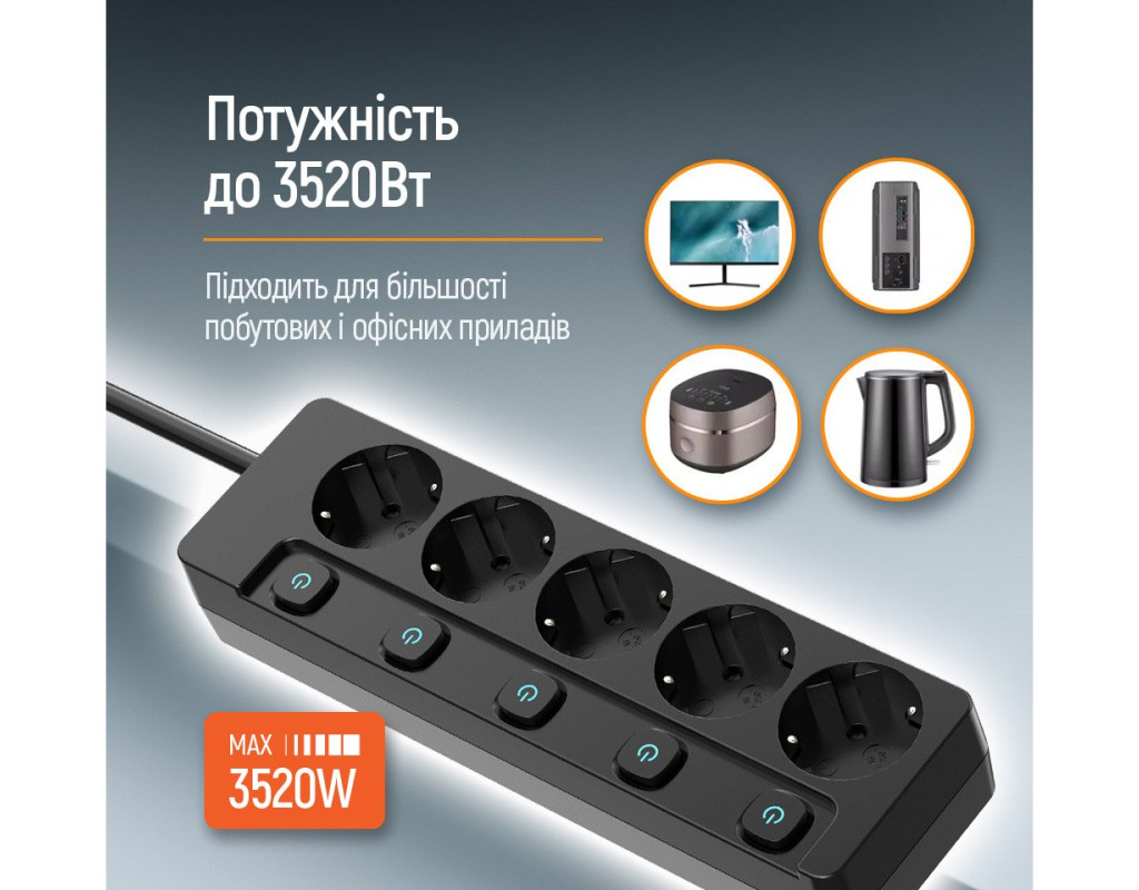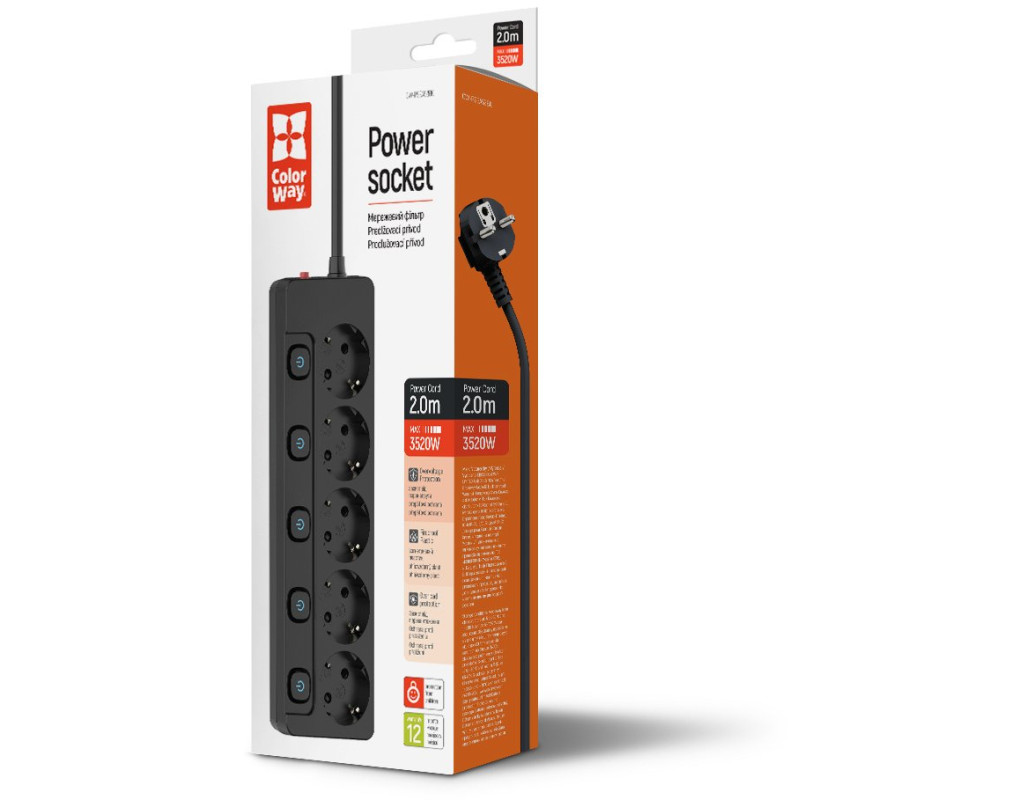 | Мережевий подовжувач ColorWay, 220В, 5 розеток з індивідуальними вимикачами Мережевий подовжувач ColorWay – надійний та зручний пристрій для підключення електроприладів у вашому будинку або офісі. Завдяки індивідуальним вимикачам на кожну розетку, вбудованому захисту від перенапруги та автомату захисту від перевантаження, він забезпечує безпеку ваших приладів і комфорт у використанні. Особливості: