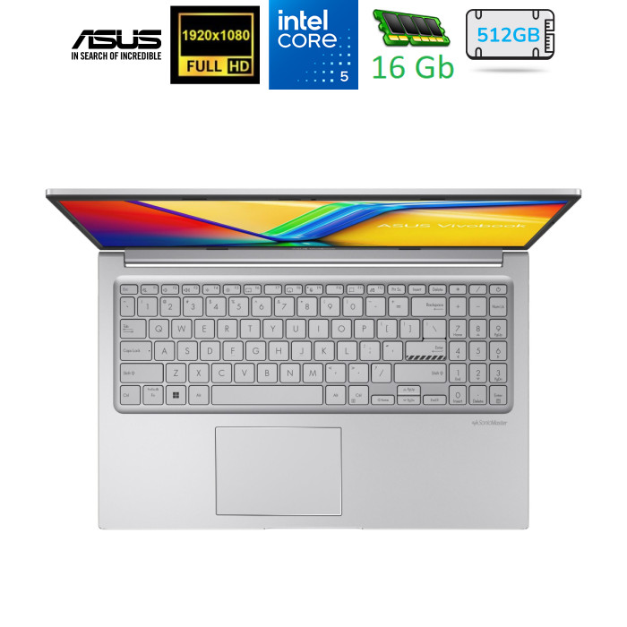 Ноутбук Asus Vivobook 15 X1504VA-BQ3833WS (90NB13Y2-M01D90); 15.6" FullHD (1920x1080) IPS LED матовий / Intel Core 5 120U (1.4 - 5.0 ГГц) / RAM 16 ГБ (Max 16 ГБ) / SSD 512 ГБ / Intel Graphics / без ОП / Wi-Fi / BT / Windows 11 Home / MIL-STD 810H / TPM / пластик / 1.7 кг / сріблястий / підсвічування клавіатури